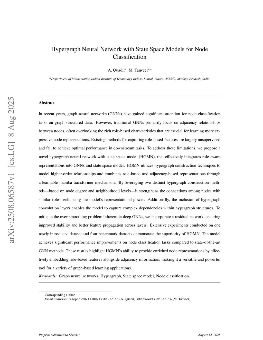 In recent years, graph neural networks (GNNs) have gained significant attention for node classification tasks on graph-structured data. However, traditional GNNs primarily focus on adjacency relationships between nodes, often overlooking the role-based characteristics that can provide complementary insights for learning expressive node representations. Existing frameworks for extracting role-based features are largely unsupervised and often fail to translate effectively into downstream predictive tasks. To address these limitations, we propose a hypergraph neural network with a state space model (HGMN). The model integrates role-aware representations into GNNs by combining hypergraph construction with state-space modeling in a principled manner. HGMN employs hypergraph construction techniques to capture higher-order relationships and leverages a learnable mamba transformer mechanism to fuse role-based and adjacency-based embeddings. By exploring two distinct hypergraph construction strategies, degree-based and neighborhood-based, the framework reinforces connectivity among nodes with structural similarity, thereby enriching the learned representations. Furthermore, the inclusion of hypergraph convolution layers enables the model to account for complex dependencies within hypergraph structures. To alleviate the over-smoothing problem encountered in deeper networks, we incorporate residual connections, which improve stability and promote effective feature propagation across layers. Comprehensive experiments on benchmark datasets including OGB, ACM, DBLP, IIP TerroristRel, Cora, Citeseer, and Pubmed demonstrate that HGMN consistently outperforms strong baselines in node classification tasks. These results support the claim that explicitly incorporating role-based features within a hypergraph framework offers tangible benefits for node classification tasks.