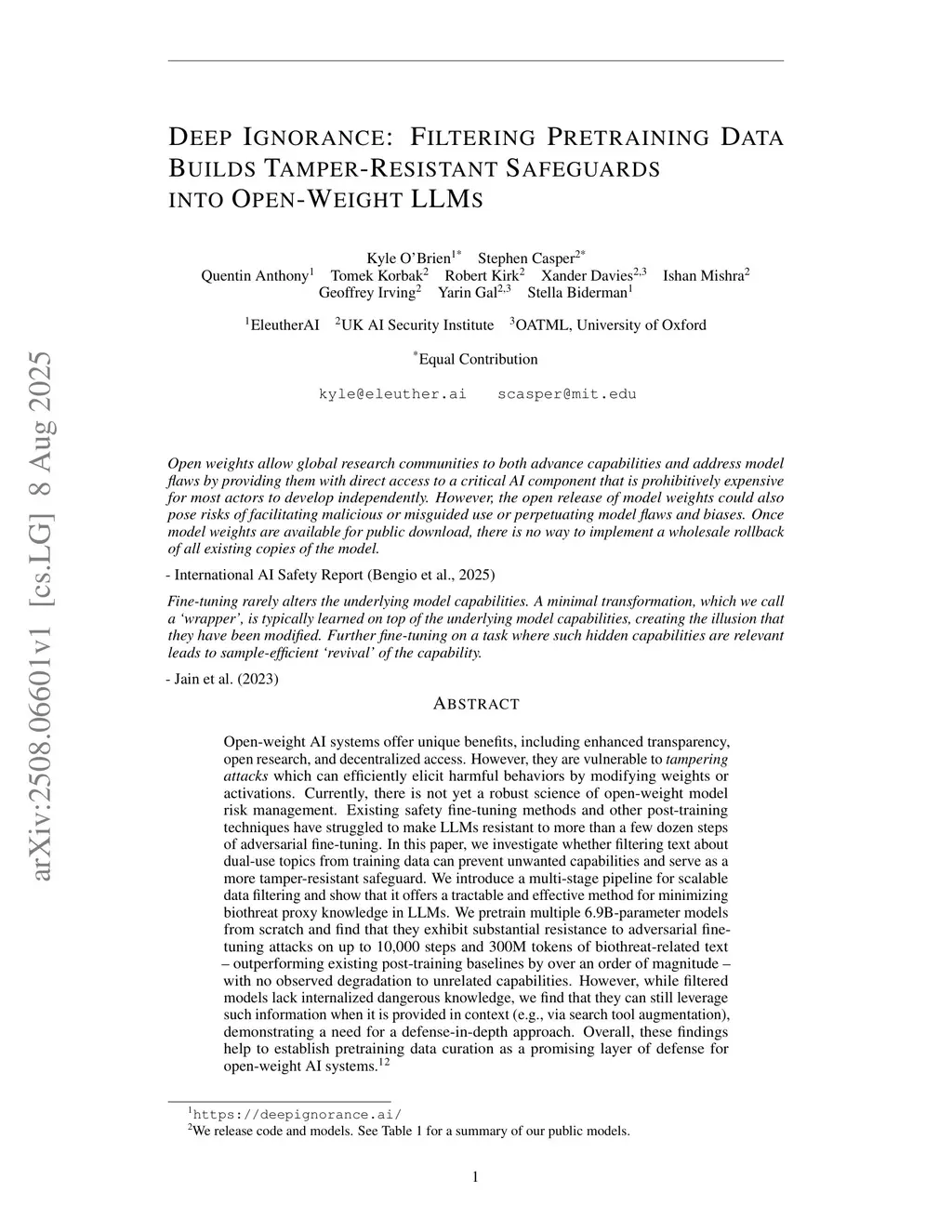 Deep Ignorance: Filtering Pretraining Data Builds Tamper-Resistant Safeguards into Open-Weight LLMs