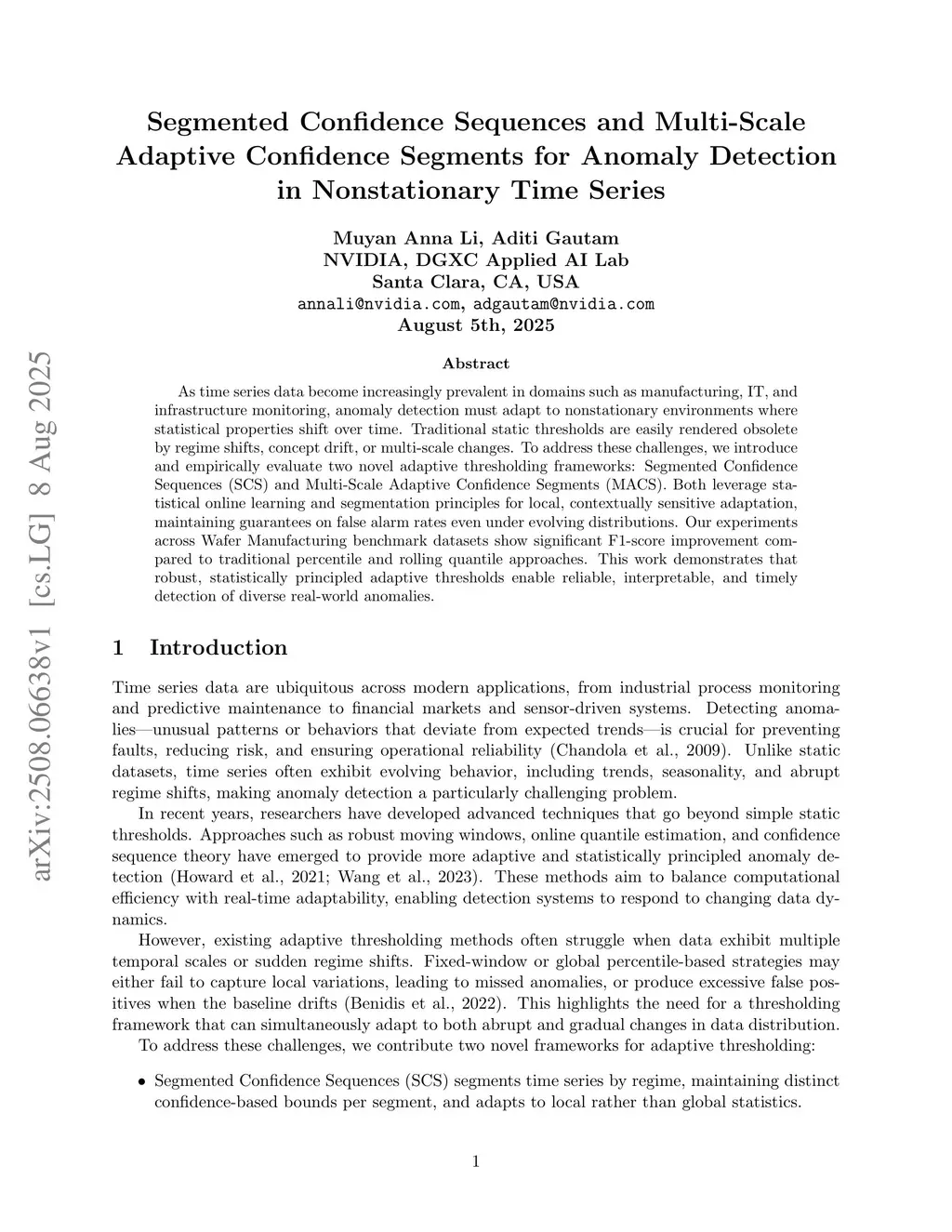 As time series data become increasingly prevalent in domains such as manufacturing, IT, and infrastructure monitoring, anomaly detection must adapt to nonstationary environments where statistical properties shift over time. Traditional static thresholds are easily rendered obsolete by regime shifts, concept drift, or multi-scale changes. To address these challenges, we introduce and empirically evaluate two novel adaptive thresholding frameworks: Segmented Confidence Sequences (SCS) and Multi-Scale Adaptive Confidence Segments (MACS). Both leverage statistical online learning and segmentation principles for local, contextually sensitive adaptation, maintaining guarantees on false alarm rates even under evolving distributions. Our experiments across Wafer Manufacturing benchmark datasets show significant F1-score improvement compared to traditional percentile and rolling quantile approaches. This work demonstrates that robust, statistically principled adaptive thresholds enable reliable, interpretable, and timely detection of diverse real-world anomalies.