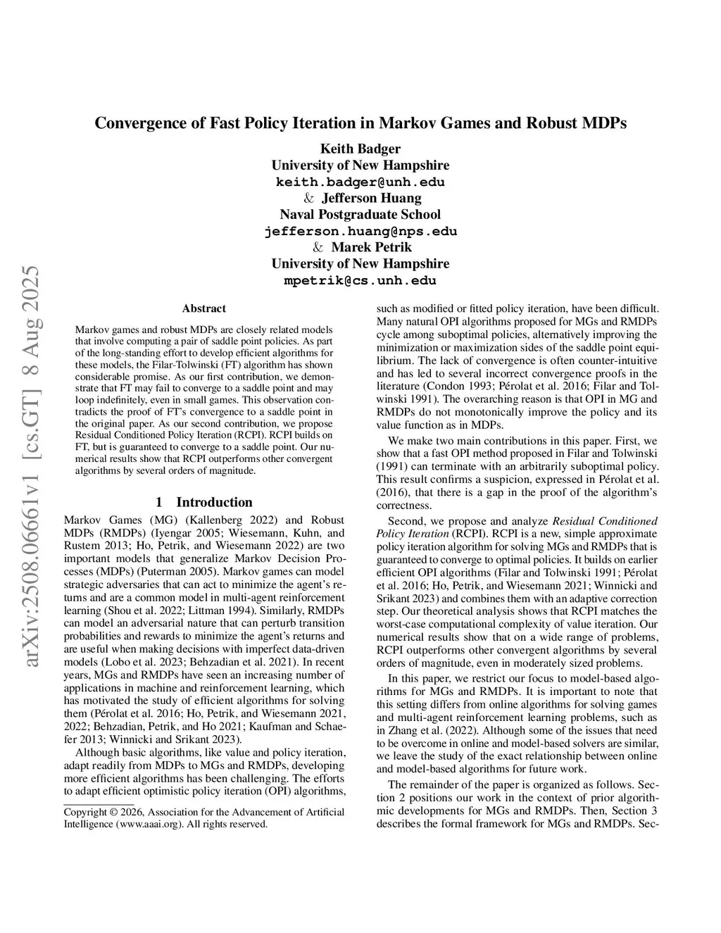 Markov games and robust MDPs are closely related models that involve computing a pair of saddle point policies. As part of the long-standing effort to develop efficient algorithms for these models, the Filar-Tolwinski (FT) algorithm has shown considerable promise. As our first contribution, we demonstrate that FT may fail to converge to a saddle point and may loop indefinitely, even in small games. This observation contradicts the proof of FT's convergence to a saddle point in the original paper. As our second contribution, we propose Residual Conditioned Policy Iteration (RCPI). RCPI builds on FT, but is guaranteed to converge to a saddle point. Our numerical results show that RCPI outperforms other convergent algorithms by several orders of magnitude.