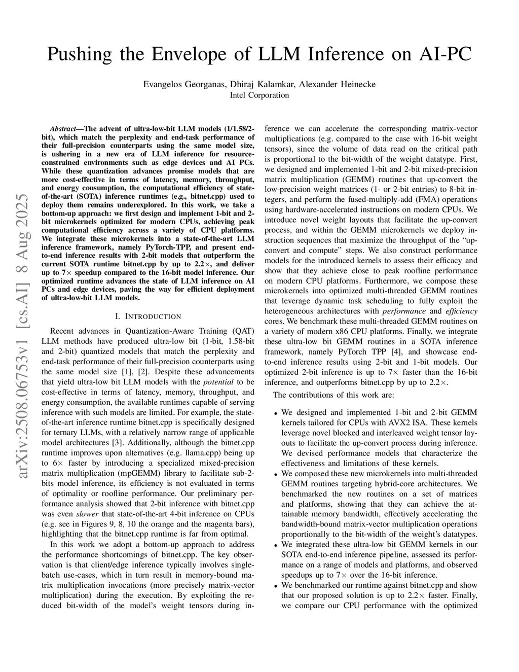 The advent of ultra-low-bit LLM models (1/1.58/2-bit), which match the perplexity and end-task performance of their full-precision counterparts using the same model size, is ushering in a new era of LLM inference for resource-constrained environments such as edge devices and AI PCs. While these quantization advances promise models that are more cost-effective in terms of latency, memory, throughput, and energy consumption, the computational efficiency of state-of-the-art (SOTA) inference runtimes (e.g.,this http URL) used to deploy them remains underexplored. In this work, we take a bottom-up approach: we first design and implement 1-bit and 2-bit microkernels optimized for modern CPUs, achieving peak computational efficiency across a variety of CPU platforms. We integrate these microkernels into a state-of-the-art LLM inference framework, namely PyTorch-TPP, and present end-to-end inference results with 2-bit models that outperform the current SOTA runtimethis http URLby up to 2.2x, and deliver up to 7x speedup compared to the 16-bit model inference. We then extend this work to Intel GPUs where we design and implement mixed precision, 2-bit GEMM kernels, and show their performance to be close to optimal. We integrated our optimized Xe2 kernels in the vLLM framework as a quantization plugin and evaluated end-to-end LLM inference results for a range of LLM models and Xe2 GPUs. Depending on the model and platform, we see a 4x - 8x reduction in GEMM time compared to the BF16 case, and we get up to 6.3x speedup in end-to-end latency compared to the BF16 execution. Our optimized runtime advances the state of LLM inference on AI PCs and Intel Xe GPUs, paving the way for efficient deployment of ultra-low-bit LLM models.