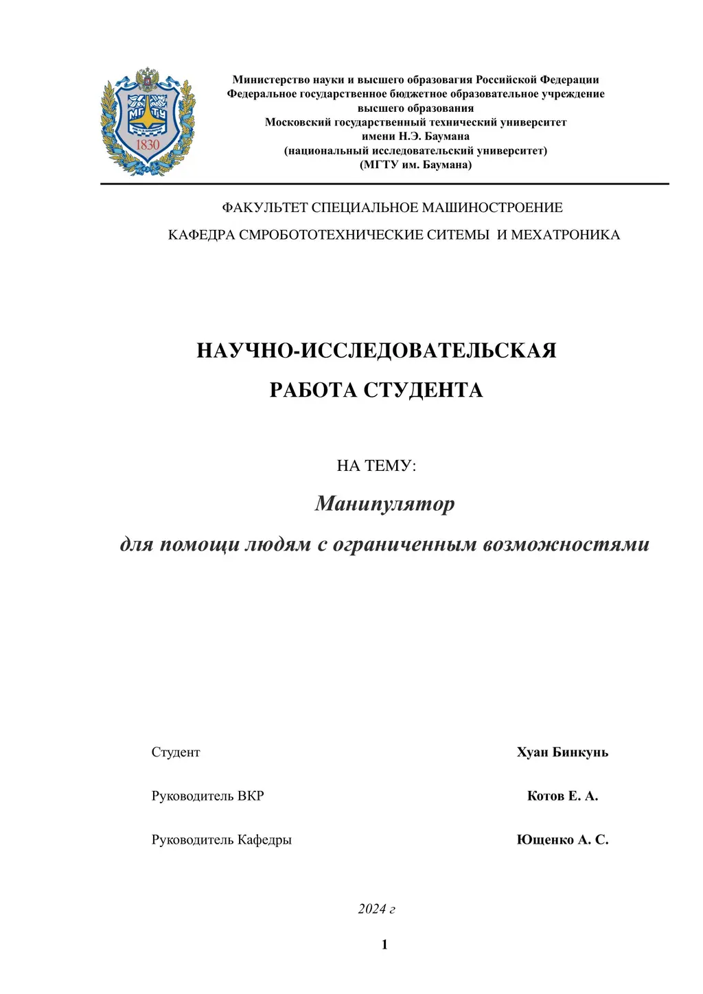The topic of this final qualification work was chosen due to the importance of developing robotic systems designed to assist people with disabilities. Advances in robotics and automation technologies have opened up new prospects for creating devices that can significantly improve the quality of life for these people. In this context, designing a robotic hand with a control system adapted to the needs of people with disabilities is a major scientific and practical challenge. This work addresses the problem of developing and manufacturing a four-degree-of-freedom robotic hand suitable for practical manipulation. Addressing this issue requires a comprehensive approach, encompassing the design of the hand's mechanical structure, the development of its control system, and its integration with a technical vision system and software based on the Robot Operating System (ROS).