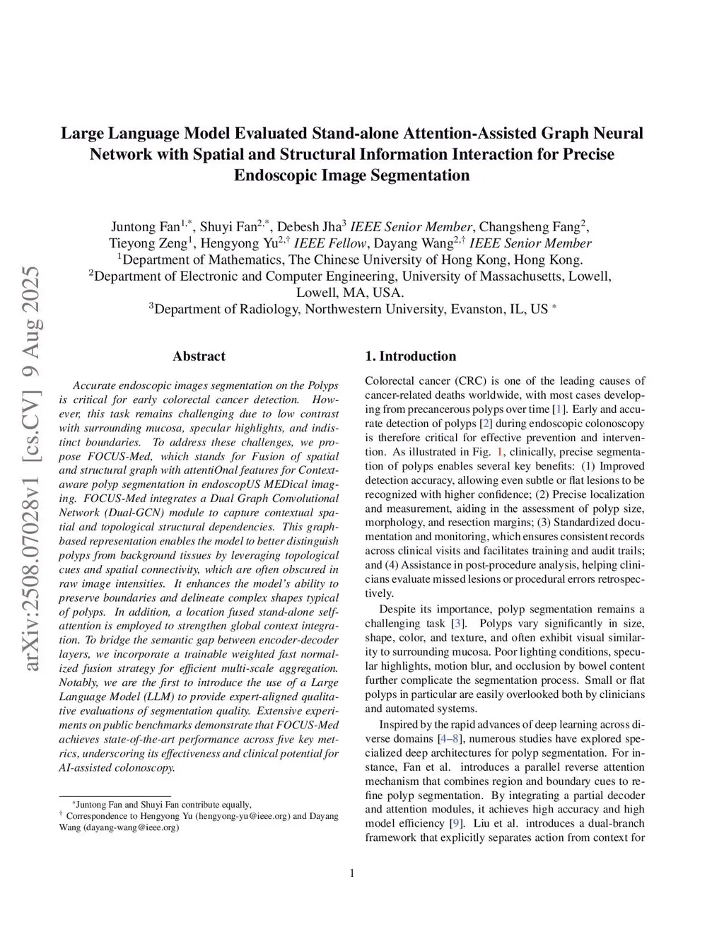 Accurate endoscopic image segmentation on the polyps is critical for early colorectal cancer detection. However, this task remains challenging due to low contrast with surrounding mucosa, specular highlights, and indistinct boundaries. To address these challenges, we propose FOCUS-Med, which stands for Fusion of spatial and structural graph with attentional context-aware polyp segmentation in endoscopic medical imaging. FOCUS-Med integrates a Dual Graph Convolutional Network (Dual-GCN) module to capture contextual spatial and topological structural dependencies. This graph-based representation enables the model to better distinguish polyps from background tissues by leveraging topological cues and spatial connectivity, which are often obscured in raw image intensities. It enhances the model's ability to preserve boundaries and delineate complex shapes typical of polyps. In addition, a location-fused stand-alone self-attention is employed to strengthen global context integration. To bridge the semantic gap between encoder-decoder layers, we incorporate a trainable weighted fast normalized fusion strategy for efficient multi-scale aggregation. Notably, we are the first to introduce the use of a Large Language Model (LLM) to provide detailed qualitative evaluations of segmentation quality. Extensive experiments on public benchmarks demonstrate that FOCUS-Med achieves state-of-the-art performance across five key metrics, underscoring its effectiveness and clinical potential for AI-assisted colonoscopy.