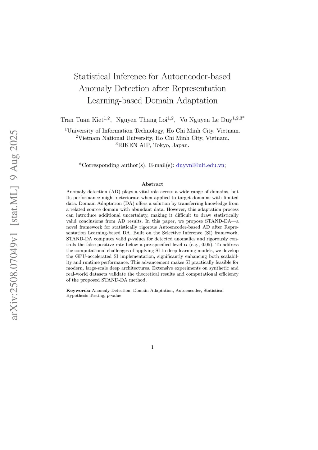Anomaly detection (AD) plays a vital role across a wide range of domains, but its performance might deteriorate when applied to target domains with limited data. Domain Adaptation (DA) offers a solution by transferring knowledge from a related source domain with abundant data. However, this adaptation process can introduce additional uncertainty, making it difficult to draw statistically valid conclusions from AD results. In this paper, we propose STAND-DA -- a novel framework for statistically rigorous Autoencoder-based AD after Representation Learning-based DA. Built on the Selective Inference (SI) framework, STAND-DA computes valid -values for detected anomalies and rigorously controls the false positive rate below a pre-specified level (e.g., 0.05). To address the computational challenges of applying SI to deep learning models, we develop the GPU-accelerated SI implementation, significantly enhancing both scalability and runtime performance. This advancement makes SI practically feasible for modern, large-scale deep architectures. Extensive experiments on synthetic and real-world datasets validate the theoretical results and computational efficiency of the proposed STAND-DA method.