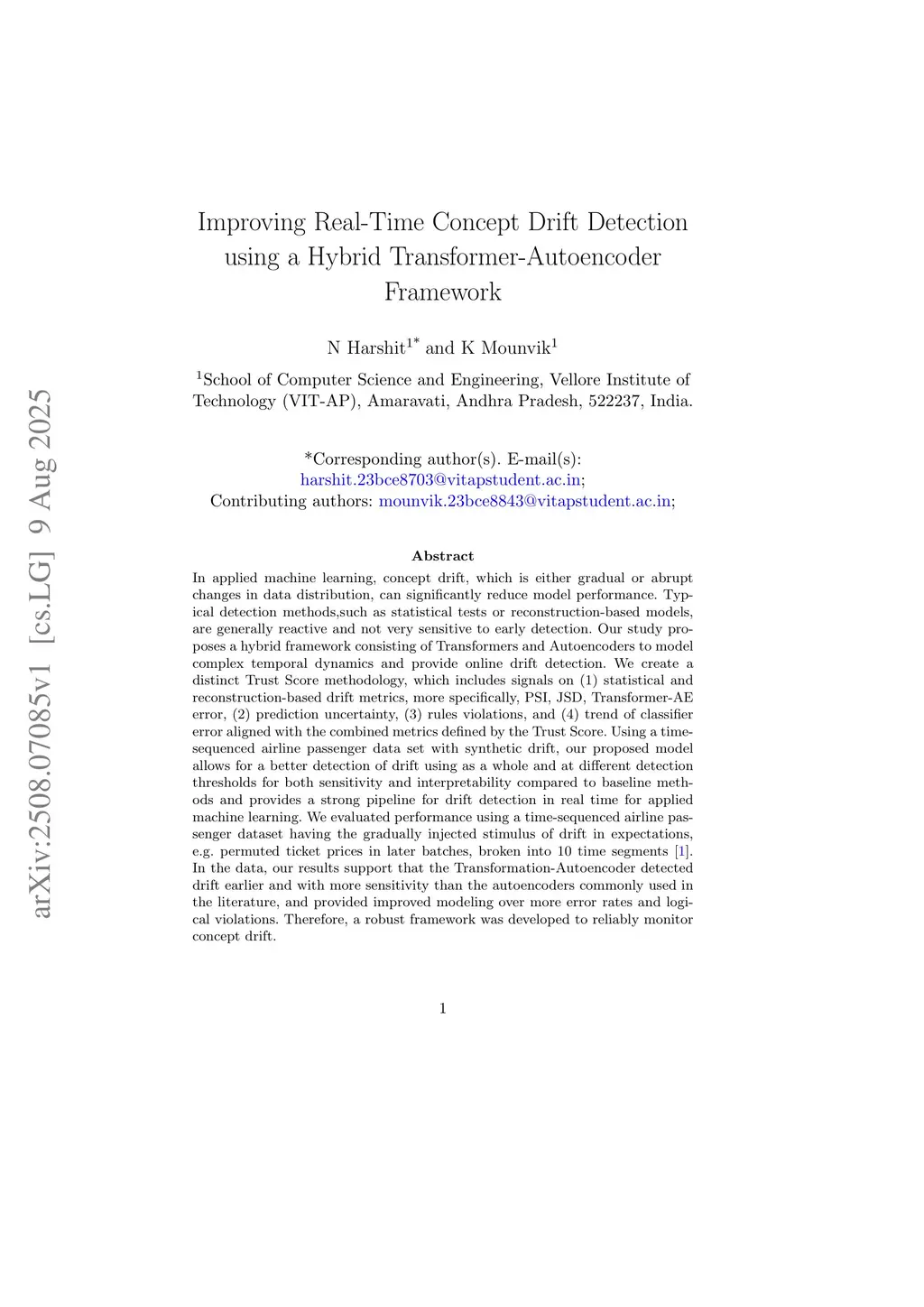 In applied machine learning, concept drift, which is either gradual or abrupt changes in data distribution, can significantly reduce model performance. Typical detection methods,such as statistical tests or reconstruction-based models,are generally reactive and not very sensitive to early detection. Our study proposes a hybrid framework consisting of Transformers and Autoencoders to model complex temporal dynamics and provide online drift detection. We create a distinct Trust Score methodology, which includes signals on (1) statistical and reconstruction-based drift metrics, more specifically, PSI, JSD, Transformer-AE error, (2) prediction uncertainty, (3) rules violations, and (4) trend of classifier error aligned with the combined metrics defined by the Trust Score. Using a time sequenced airline passenger data set with synthetic drift, our proposed model allows for a better detection of drift using as a whole and at different detection thresholds for both sensitivity and interpretability compared to baseline methods and provides a strong pipeline for drift detection in real time for applied machine learning. We evaluated performance using a time-sequenced airline passenger dataset having the gradually injected stimulus of drift in expectations,e.g. permuted ticket prices in later batches, broken into 10 time segments [1].In the data, our results support that the Transformation-Autoencoder detected drift earlier and with more sensitivity than the autoencoders commonly used in the literature, and provided improved modeling over more error rates and logical violations. Therefore, a robust framework was developed to reliably monitor concept drift.