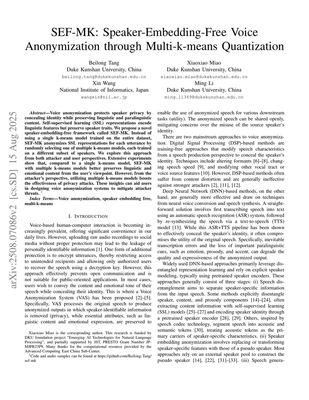 SEF-MK: Speaker-Embedding-Free Voice Anonymization through Multi-k-means Quantization