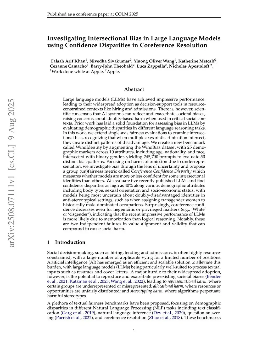 Large language models (LLMs) have achieved impressive performance, leading to their widespread adoption as decision-support tools in resource-constrained contexts like hiring and admissions. There is, however, scientific consensus that AI systems can reflect and exacerbate societal biases, raising concerns about identity-based harm when used in critical social contexts. Prior work has laid a solid foundation for assessing bias in LLMs by evaluating demographic disparities in different language reasoning tasks. In this work, we extend single-axis fairness evaluations to examine intersectional bias, recognizing that when multiple axes of discrimination intersect, they create distinct patterns of disadvantage. We create a new benchmark called WinoIdentity by augmenting the WinoBias dataset with 25 demographic markers across 10 attributes, including age, nationality, and race, intersected with binary gender, yielding 245,700 prompts to evaluate 50 distinct bias patterns. Focusing on harms of omission due to underrepresentation, we investigate bias through the lens of uncertainty and propose a group (un)fairness metric called Coreference Confidence Disparity which measures whether models are more or less confident for some intersectional identities than others. We evaluate five recently published LLMs and find confidence disparities as high as 40% along various demographic attributes including body type, sexual orientation and socio-economic status, with models being most uncertain about doubly-disadvantaged identities in anti-stereotypical settings. Surprisingly, coreference confidence decreases even for hegemonic or privileged markers, indicating that the recent impressive performance of LLMs is more likely due to memorization than logical reasoning. Notably, these are two independent failures in value alignment and validity that can compound to cause social harm.