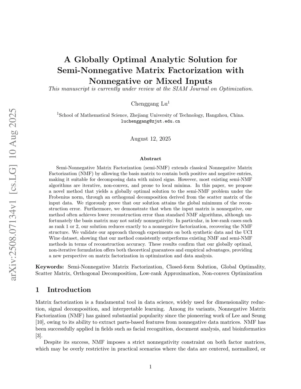 Semi-Nonnegative Matrix Factorization (semi-NMF) extends classical Nonnegative Matrix Factorization (NMF) by allowing the basis matrix to contain both positive and negative entries, making it suitable for decomposing data with mixed signs. However, most existing semi-NMF algorithms are iterative, non-convex, and prone to local minima. In this paper, we propose a novel method that yields a globally optimal solution to the semi-NMF problem under the Frobenius norm, through an orthogonal decomposition derived from the scatter matrix of the input data. We rigorously prove that our solution attains the global minimum of the reconstruction error. Furthermore, we demonstrate that when the input matrix is nonnegative, our method often achieves lower reconstruction error than standard NMF algorithms, although unfortunately the basis matrix may not satisfy nonnegativity. In particular, in low-rank cases such as rank 1 or 2, our solution reduces exactly to a nonnegative factorization, recovering the NMF structure. We validate our approach through experiments on both synthetic data and the UCI Wine dataset, showing that our method consistently outperforms existing NMF and semi-NMF methods in terms of reconstruction accuracy. These results confirm that our globally optimal, non-iterative formulation offers both theoretical guarantees and empirical advantages, providing a new perspective on matrix factorization in optimization and data analysis.