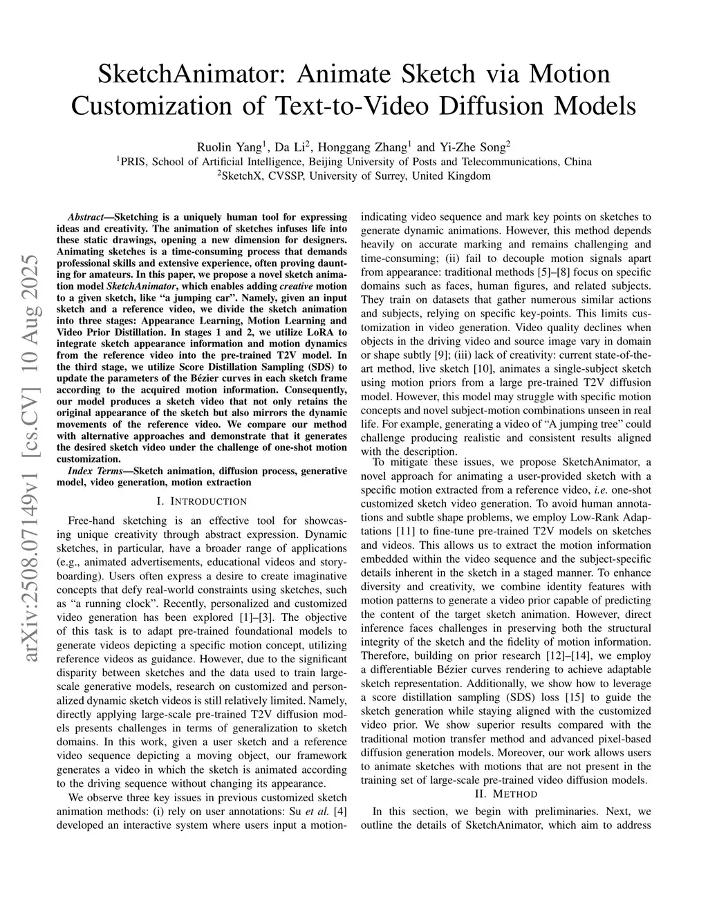 Sketching is a uniquely human tool for expressing ideas and creativity. The animation of sketches infuses life into these static drawings, opening a new dimension for designers. Animating sketches is a time-consuming process that demands professional skills and extensive experience, often proving daunting for amateurs. In this paper, we propose a novel sketch animation model SketchAnimator, which enables adding creative motion to a given sketch, like "a jumping car''. Namely, given an input sketch and a reference video, we divide the sketch animation into three stages: Appearance Learning, Motion Learning and Video Prior Distillation. In stages 1 and 2, we utilize LoRA to integrate sketch appearance information and motion dynamics from the reference video into the pre-trained T2V model. In the third stage, we utilize Score Distillation Sampling (SDS) to update the parameters of the Bezier curves in each sketch frame according to the acquired motion information. Consequently, our model produces a sketch video that not only retains the original appearance of the sketch but also mirrors the dynamic movements of the reference video. We compare our method with alternative approaches and demonstrate that it generates the desired sketch video under the challenge of one-shot motion customization.