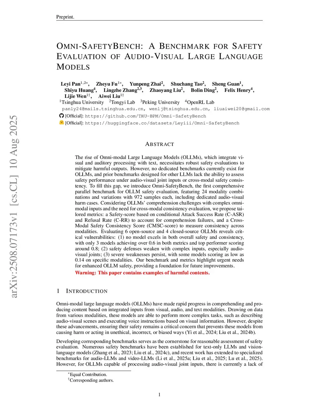 Omni-SafetyBench: A Benchmark for Safety Evaluation of Audio-Visual Large Language Models
