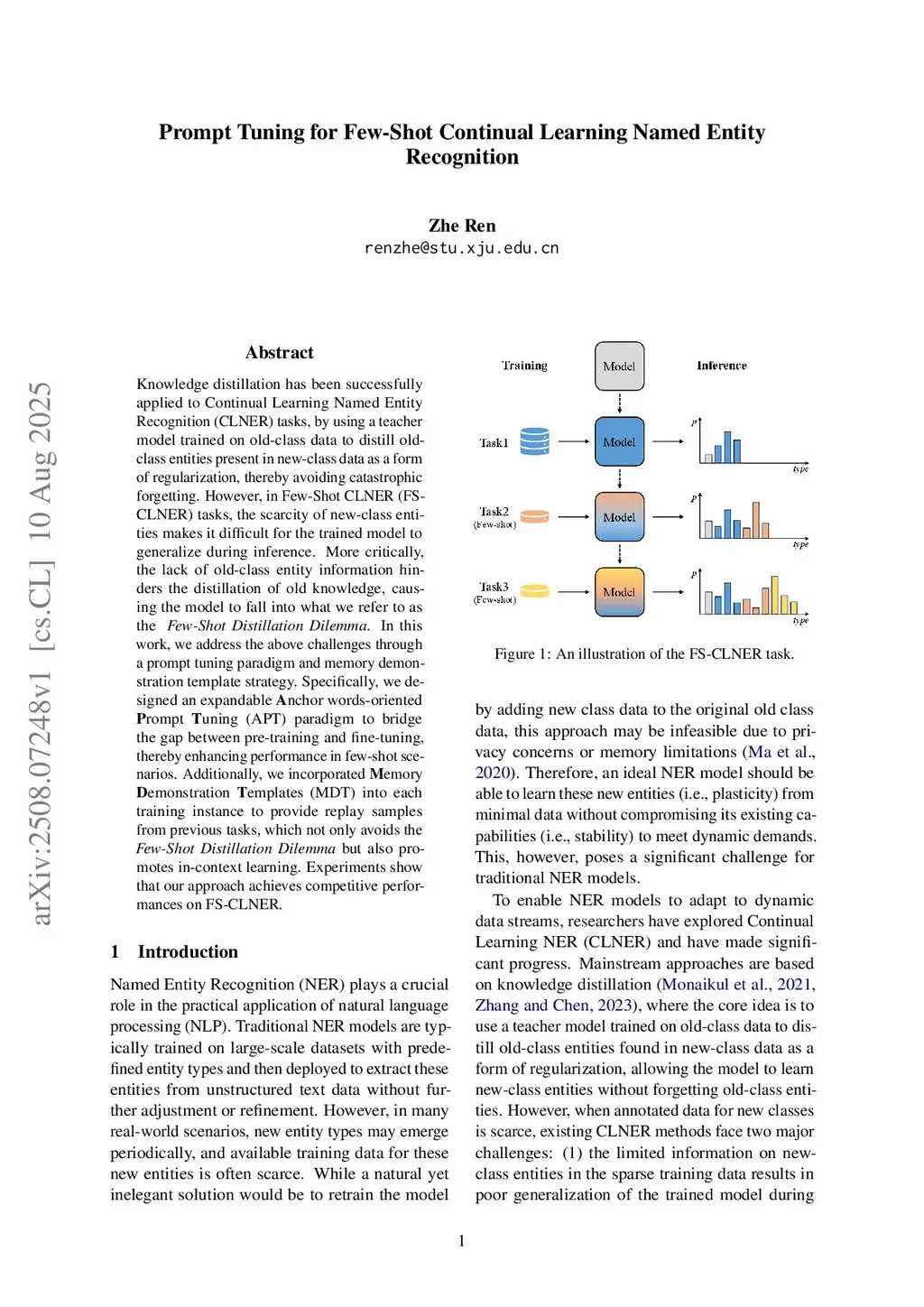 Knowledge distillation has been successfully applied to Continual Learning Named Entity Recognition (CLNER) tasks, by using a teacher model trained on old-class data to distill old-class entities present in new-class data as a form of regularization, thereby avoiding catastrophic forgetting. However, in Few-Shot CLNER (FS-CLNER) tasks, the scarcity of new-class entities makes it difficult for the trained model to generalize during inference. More critically, the lack of old-class entity information hinders the distillation of old knowledge, causing the model to fall into what we refer to as the Few-Shot Distillation Dilemma. In this work, we address the above challenges through a prompt tuning paradigm and memory demonstration template strategy. Specifically, we designed an expandable Anchor words-oriented Prompt Tuning (APT) paradigm to bridge the gap between pre-training and fine-tuning, thereby enhancing performance in few-shot scenarios. Additionally, we incorporated Memory Demonstration Templates (MDT) into each training instance to provide replay samples from previous tasks, which not only avoids the Few-Shot Distillation Dilemma but also promotes in-context learning. Experiments show that our approach achieves competitive performances on FS-CLNER.