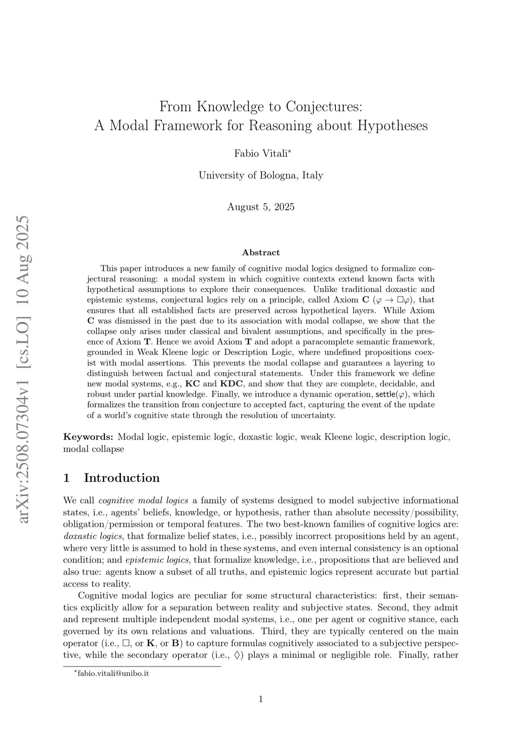 This paper introduces a new family of cognitive modal logics designed to formalize conjectural reasoning: modal systems in which cognitive contexts extend known facts with hypothetical assumptions in order to explore their consequences. Unlike traditional doxastic and epistemic systems, conjectural logics rely on a principle, called Axiom \textbf{C} (), through which established facts are preserved across conjectural layers. While Axiom \textbf{C} has often been treated with suspicion because of its association with modal collapse, we show that collapse does not arise from \textbf{C} alone, but requires either the presence of Axiom \textbf{T} or a concretely bivalent base logic. Accordingly, we avoid \textbf{T} and adopt a non-bivalent semantic framework, such as supervaluation-style semantics, Weak Kleene logic, or Description Logic, in which undefined propositions may coexist with modal assertions. This prevents modal collapse and preserves a distinction between factual and conjectural statements. Within this framework we define the modal systems and , show that Axiom \textbf{C} directly implies \textbf{4} and \textbf{5}, and prove that these systems are non-trivial, sound, and complete. An inclusion theorem links reality, doxastic states, epistemic states, and conjectural states via set-theoretic inclusion among valuations, providing a unified account of how these layers relate. Finally, we introduce a dynamic operator, , which formalizes the transition by which a conjectural extension becomes designated reality, thereby motivating a corresponding Conjectural Dynamic Logic.