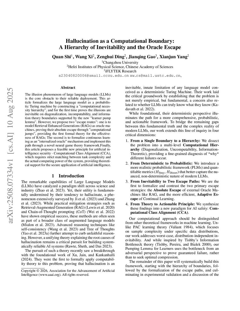 The illusion phenomenon of large language models (LLMs) is the core obstacle to their reliable deployment. This article formalizes the large language model as a probabilistic Turing machine by constructing a "computational necessity hierarchy", and for the first time proves the illusions are inevitable on diagonalization, incomputability, and information theory boundaries supported by the new "learner pump lemma". However, we propose two "escape routes": one is to model Retrieval Enhanced Generations (RAGs) as oracle machines, proving their absolute escape through "computational jumps", providing the first formal theory for the effectiveness of RAGs; The second is to formalize continuous learning as an "internalized oracle" mechanism and implement this path through a novel neural game theory framework. Finally, this article proposes a feasible new principle for artificial intelligence security - Computational Class Alignment (CCA), which requires strict matching between task complexity and the actual computing power of the system, providing theoretical support for the secure application of artificial intelligence.