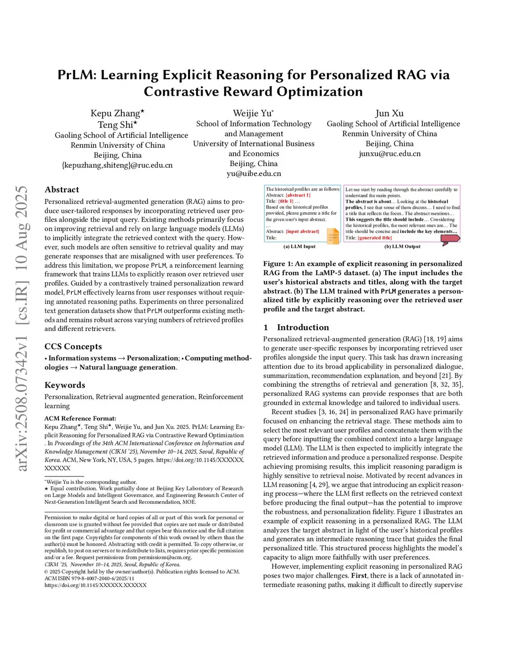 PrLM: Learning Explicit Reasoning for Personalized RAG via Contrastive Reward Optimization