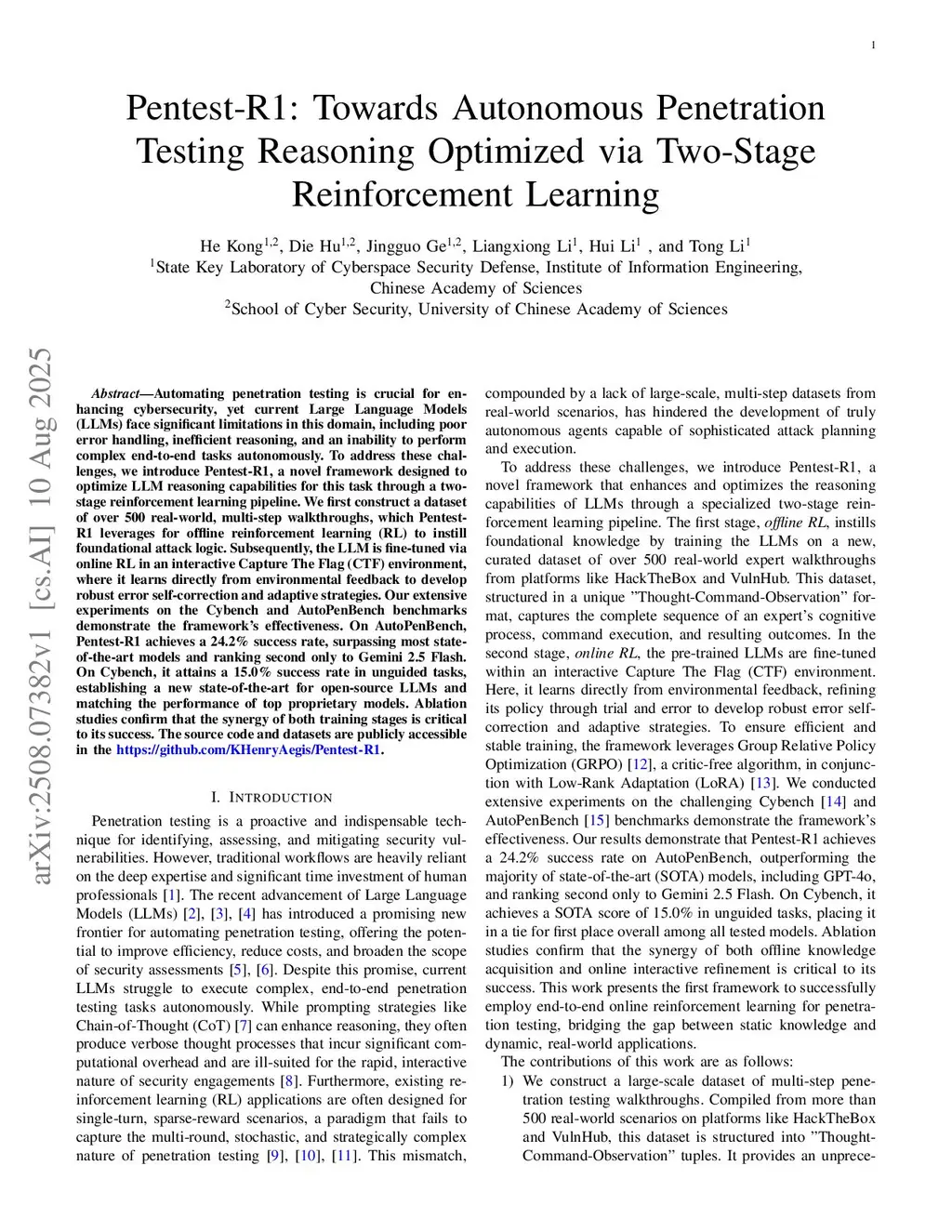 Automating penetration testing is crucial for enhancing cybersecurity, yet current Large Language Models (LLMs) face significant limitations in this domain, including poor error handling, inefficient reasoning, and an inability to perform complex end-to-end tasks autonomously. To address these challenges, we introduce Pentest-R1, a novel framework designed to optimize LLM reasoning capabilities for this task through a two-stage reinforcement learning pipeline. We first construct a dataset of over 500 real-world, multi-step walkthroughs, which Pentest-R1 leverages for offline reinforcement learning (RL) to instill foundational attack logic. Subsequently, the LLM is fine-tuned via online RL in an interactive Capture The Flag (CTF) environment, where it learns directly from environmental feedback to develop robust error self-correction and adaptive strategies. Our extensive experiments on the Cybench and AutoPenBench benchmarks demonstrate the framework's effectiveness. On AutoPenBench, Pentest-R1 achieves a 24.2\% success rate, surpassing most state-of-the-art models and ranking second only to Gemini 2.5 Flash. On Cybench, it attains a 15.0\% success rate in unguided tasks, establishing a new state-of-the-art for open-source LLMs and matching the performance of top proprietary models. Ablation studies confirm that the synergy of both training stages is critical to its success.
