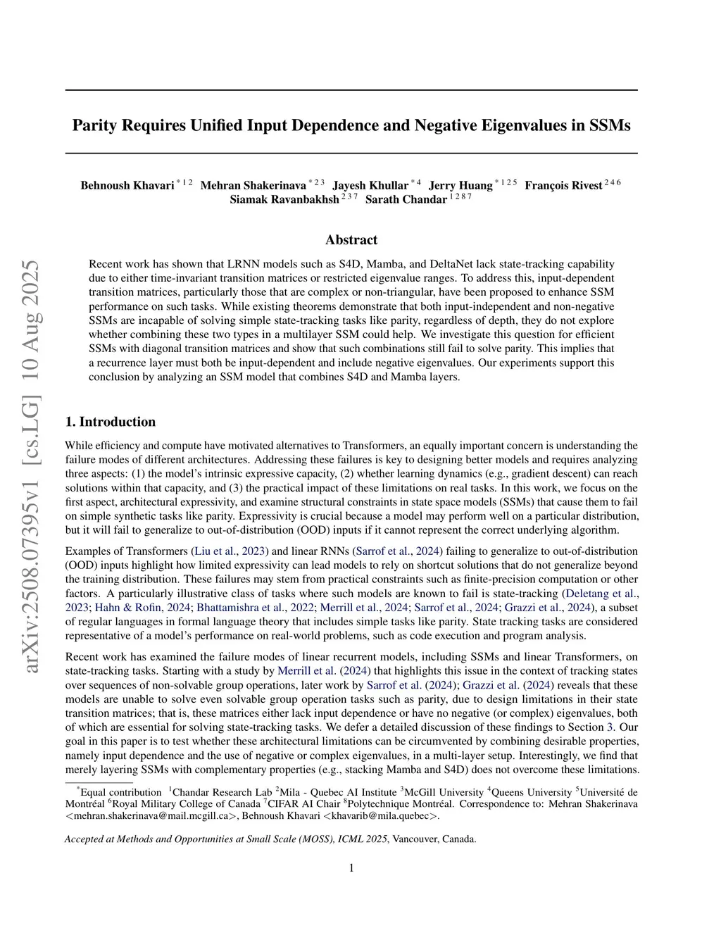Recent work has shown that LRNN models such as S4D, Mamba, and DeltaNet lack state-tracking capability due to either time-invariant transition matrices or restricted eigenvalue ranges. To address this, input-dependent transition matrices, particularly those that are complex or non-triangular, have been proposed to enhance SSM performance on such tasks. While existing theorems demonstrate that both input-independent and non-negative SSMs are incapable of solving simple state-tracking tasks, such as parity, regardless of depth, they do not explore whether combining these two types in a multilayer SSM could help. We investigate this question for efficient SSMs with diagonal transition matrices and show that such combinations still fail to solve parity. This implies that a recurrence layer must both be input-dependent and include negative eigenvalues. Our experiments support this conclusion by analyzing an SSM model that combines S4D and Mamba layers.
