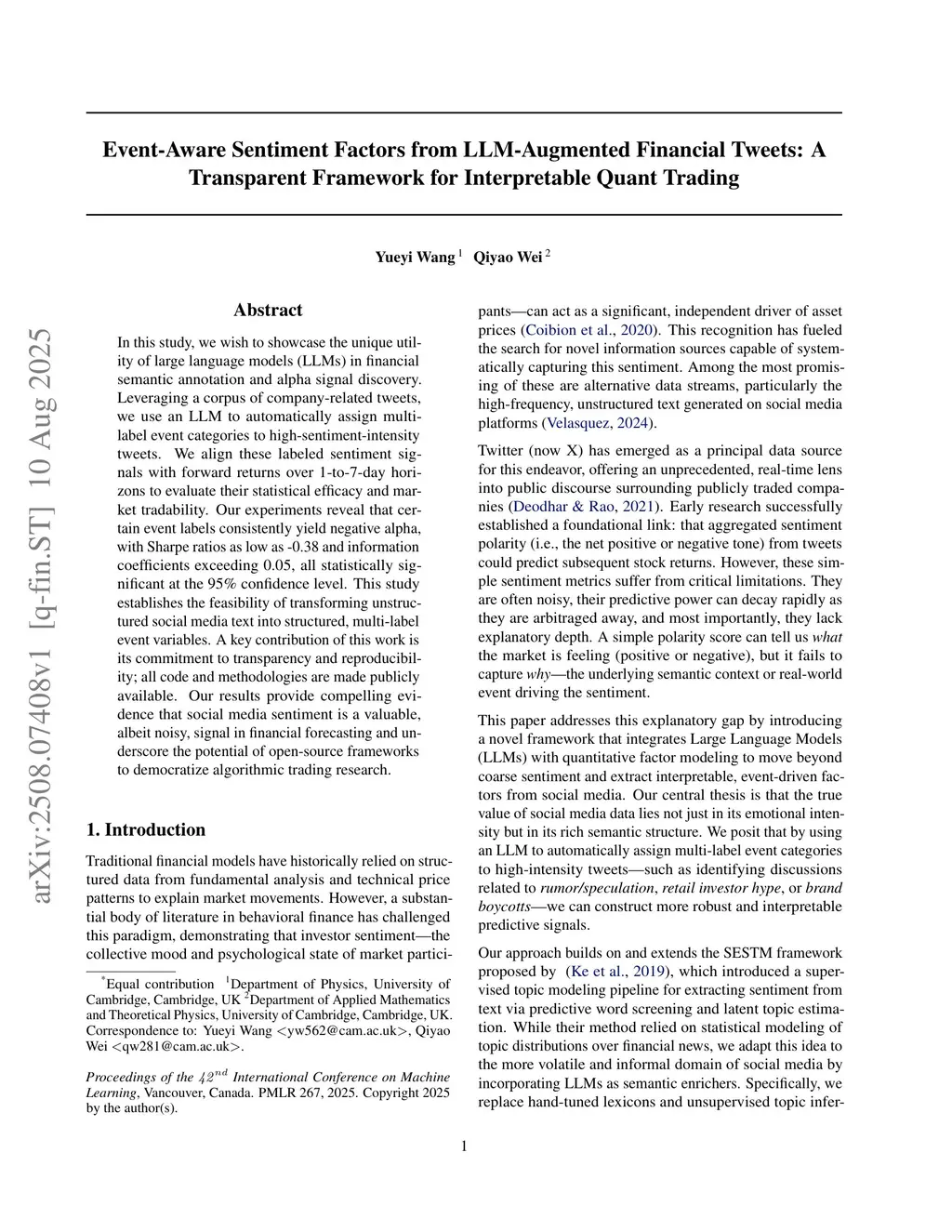 In this study, we wish to showcase the unique utility of large language models (LLMs) in financial semantic annotation and alpha signal discovery. Leveraging a corpus of company-related tweets, we use an LLM to automatically assign multi-label event categories to high-sentiment-intensity tweets. We align these labeled sentiment signals with forward returns over 1-to-7-day horizons to evaluate their statistical efficacy and market tradability. Our experiments reveal that certain event labels consistently yield negative alpha, with Sharpe ratios as low as -0.38 and information coefficients exceeding 0.05, all statistically significant at the 95\% confidence level. This study establishes the feasibility of transforming unstructured social media text into structured, multi-label event variables. A key contribution of this work is its commitment to transparency and reproducibility; all code and methodologies are made publicly available. Our results provide compelling evidence that social media sentiment is a valuable, albeit noisy, signal in financial forecasting and underscore the potential of open-source frameworks to democratize algorithmic trading research.