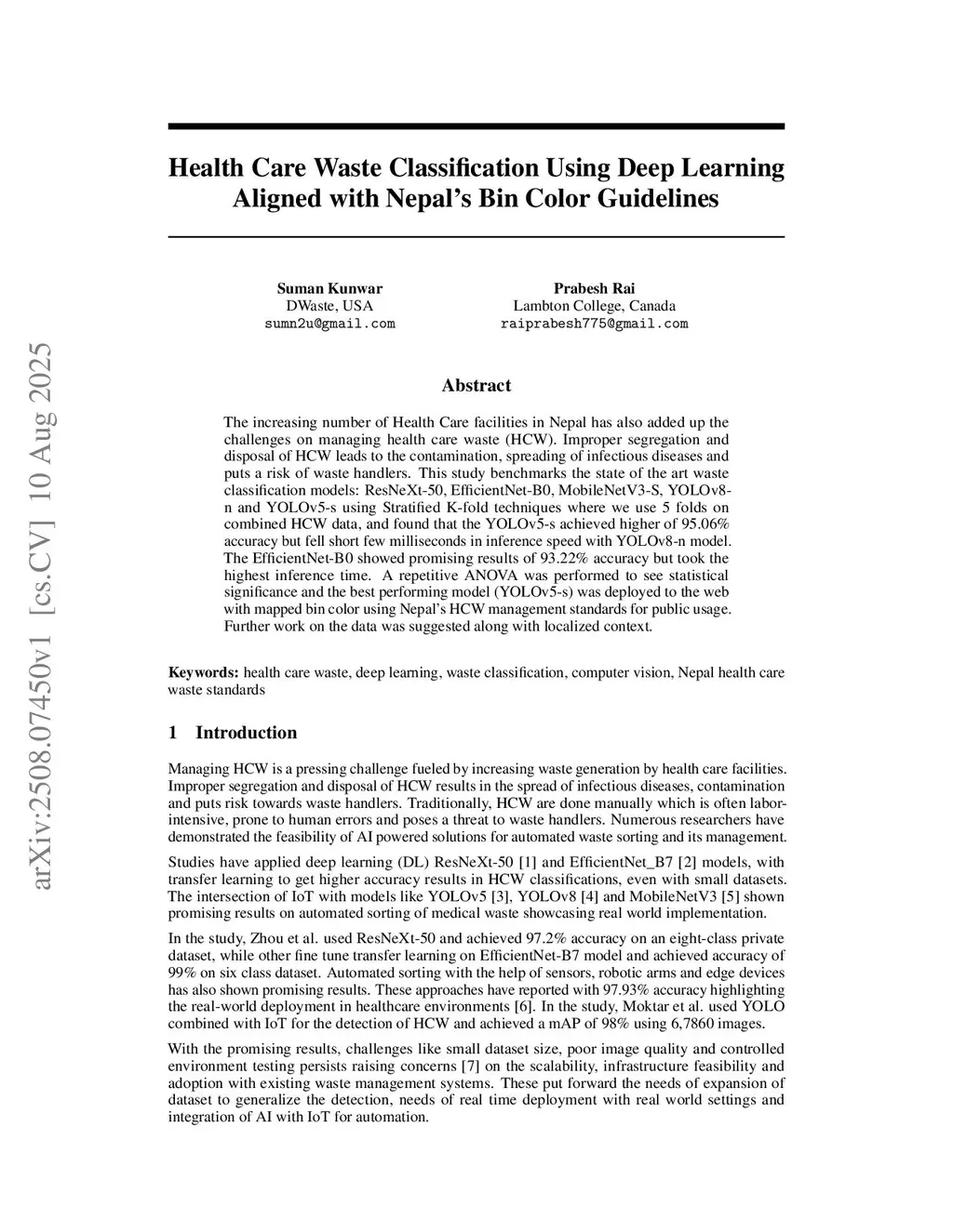 The increasing number of Health Care facilities in Nepal has added up the challenges on managing health care waste (HCW). Improper segregation and disposal of HCW leads to contamination, spreading of infectious diseases and risk for waste handlers. This study benchmarks the state of the art waste classification models: ResNeXt-50, EfficientNet-B0, MobileNetV3-S, YOLOv8-n and YOLOv5-s using stratified 5-fold cross-validation technique on combined HCW data. YOLOv5-s achieved the highest accuracy (95.06%) but fell short with the YOLOv8-n model in inference speed with few milliseconds. The EfficientNet-B0 showed promising results of 93.22% accuracy but took the highest inference time. Following a repetitive ANOVA test to confirm the statistical significance, the best performing model (YOLOv5-s) was deployed to the web with bin color mapped using Nepal's HCW management standards. Further work is suggested to address data limitation and ensure localized context.