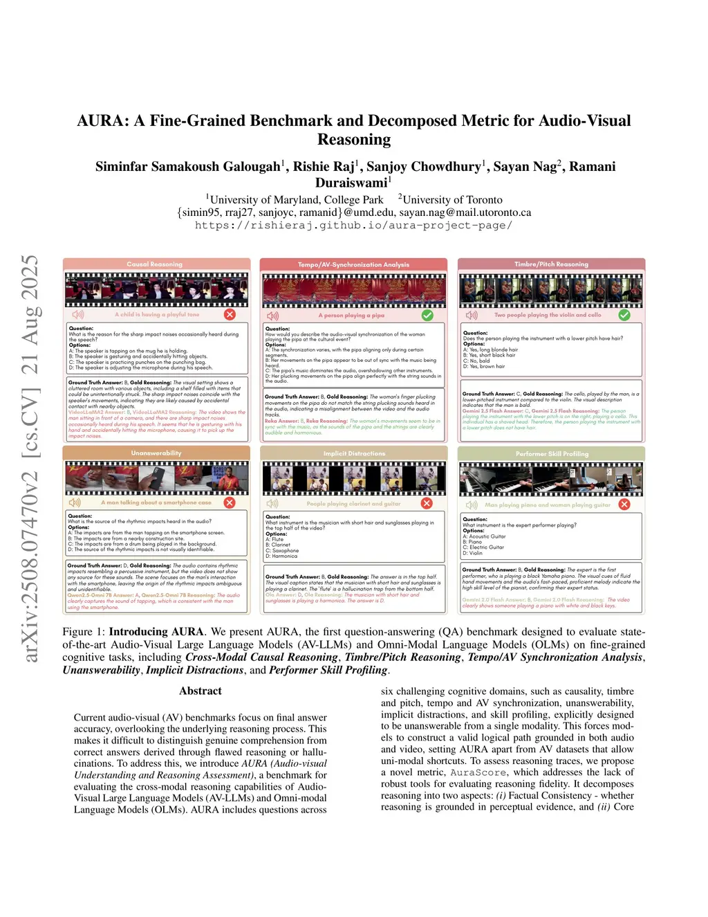 Current audio-visual (AV) benchmarks focus on final answer accuracy, overlooking the underlying reasoning process. This makes it difficult to distinguish genuine comprehension from correct answers derived through flawed reasoning or hallucinations. To address this, we introduce AURA (Audio-visual Understanding and Reasoning Assessment), a benchmark for evaluating the cross-modal reasoning capabilities of Audio-Visual Large Language Models (AV-LLMs) and Omni-modal Language Models (OLMs). AURA includes questions across six challenging cognitive domains, such as causality, timbre and pitch, tempo and AV synchronization, unanswerability, implicit distractions, and skill profiling, explicitly designed to be unanswerable from a single modality. This forces models to construct a valid logical path grounded in both audio and video, setting AURA apart from AV datasets that allow uni-modal shortcuts. To assess reasoning traces, we propose a novel metric, AuraScore, which addresses the lack of robust tools for evaluating reasoning fidelity. It decomposes reasoning into two aspects: (i) Factual Consistency - whether reasoning is grounded in perceptual evidence, and (ii) Core Inference - the logical validity of each reasoning step. Evaluations of SOTA models on AURA reveal a critical reasoning gap: although models achieve high accuracy (up to 92% on some tasks), their Factual Consistency and Core Inference scores fall below 45%. This discrepancy highlights that models often arrive at correct answers through flawed logic, underscoring the need for our benchmark and paving the way for more robust multimodal evaluation.