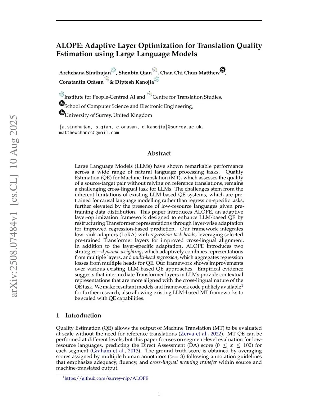 ALOPE: Adaptive Layer Optimization for Translation Quality Estimation using Large Language Models