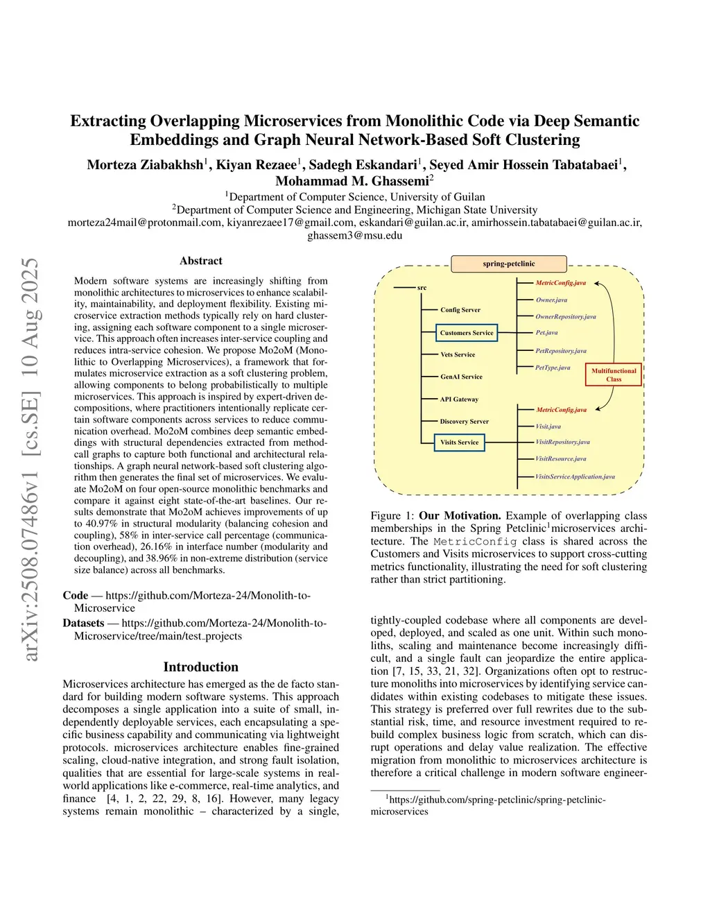 Modern software systems are increasingly shifting from monolithic architectures to microservices to enhance scalability, maintainability, and deployment flexibility. Existing microservice extraction methods typically rely on hard clustering, assigning each software component to a single microservice. This approach often increases inter-service coupling and reduces intra-service cohesion. We propose Mo2oM (Monolithic to Overlapping Microservices), a framework that formulates microservice extraction as a soft clustering problem, allowing components to belong probabilistically to multiple microservices. This approach is inspired by expert-driven decompositions, where practitioners intentionally replicate certain software components across services to reduce communication overhead. Mo2oM combines deep semantic embeddings with structural dependencies extracted from methodcall graphs to capture both functional and architectural relationships. A graph neural network-based soft clustering algorithm then generates the final set of microservices. We evaluate Mo2oM on four open-source monolithic benchmarks and compare it against eight state-of-the-art baselines. Our results demonstrate that Mo2oM achieves improvements of up to 40.97% in structural modularity (balancing cohesion and coupling), 58% in inter-service call percentage (communication overhead), 26.16% in interface number (modularity and decoupling), and 38.96% in non-extreme distribution (service size balance) across all benchmarks.