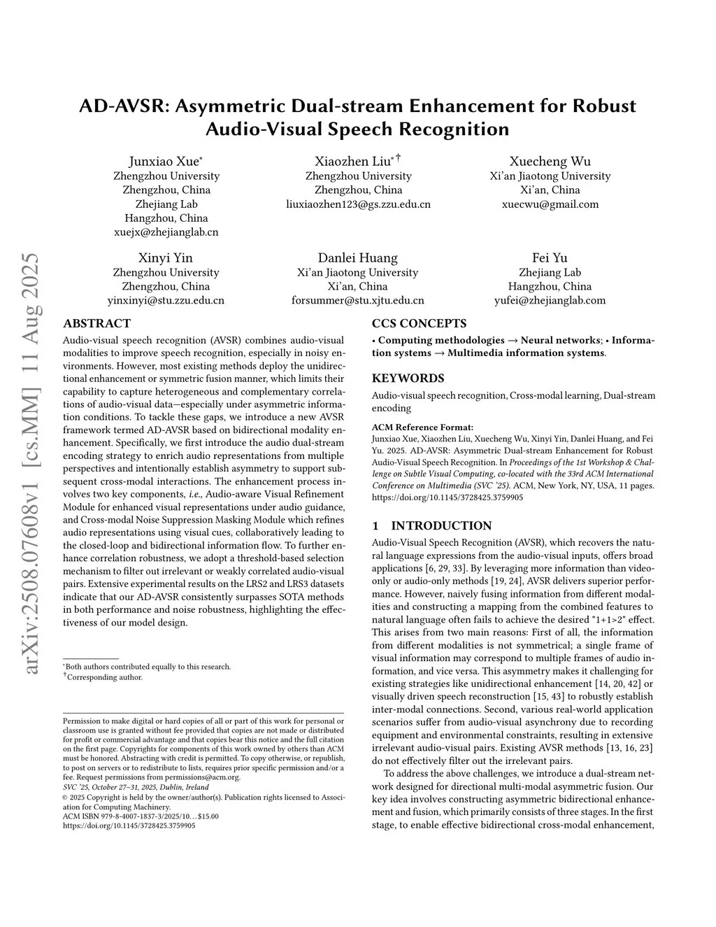 AD-AVSR: Asymmetric Dual-stream Enhancement for Robust Audio-Visual Speech Recognition