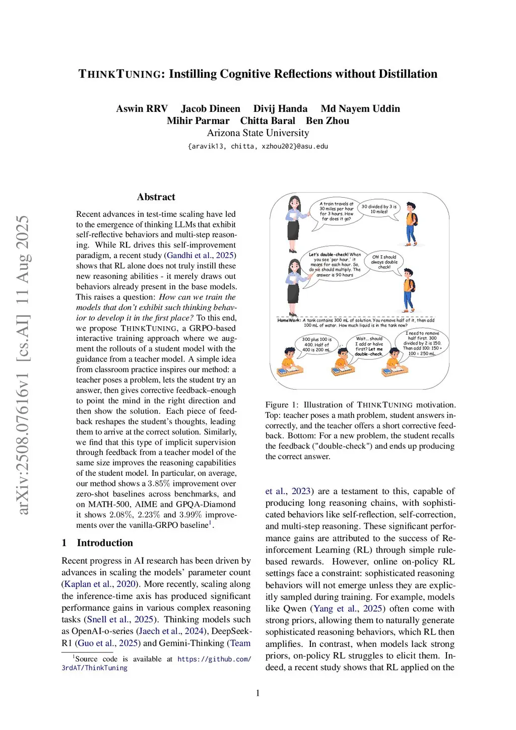 Recent advances in test-time scaling have led to the emergence of thinking LLMs that exhibit self-reflective behaviors and multi-step reasoning. While RL drives this self-improvement paradigm, a recent study (Gandhi et al., 2025) shows that RL alone does not truly instill these new reasoning abilities - it merely draws out behaviors already present in the base models. This raises a question: How can we train the models that don't exhibit such thinking behavior to develop it in the first place? To this end, we propose ThinkTuning, a GRPO-based interactive training approach where we augment the rollouts of a student model with the guidance from a teacher model. A simple idea from classroom practice inspires our method: a teacher poses a problem, lets the student try an answer, then gives corrective feedback -- enough to point the mind in the right direction and then show the solution. Each piece of feedback reshapes the student's thoughts, leading them to arrive at the correct solution. Similarly, we find that this type of implicit supervision through feedback from a teacher model of the same size improves the reasoning capabilities of the student model. In particular, on average, our method shows a 3.85% improvement over zero-shot baselines across benchmarks, and on MATH-500, AIME and GPQA-Diamond it shows 2.08%, 2.23% and 3.99% improvements over the vanilla-GRPO baseline. Source code is available atthis https URL.
