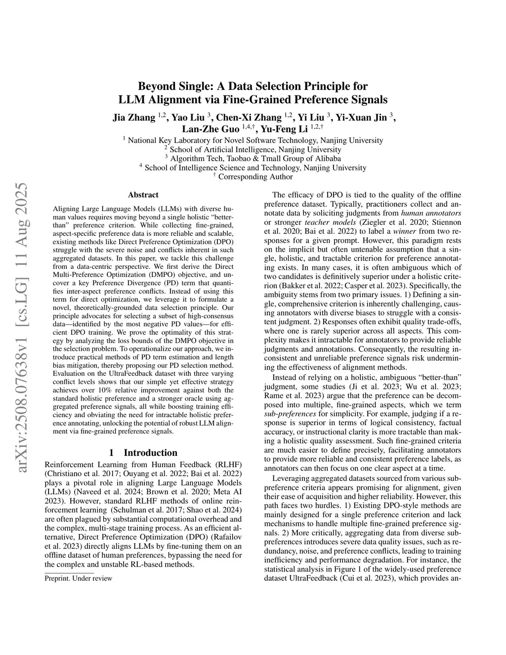 Large language models (LLMs) alignment aims to ensure that the behavior of LLMs meets human preferences. While collecting data from multiple fine-grained, aspect-specific preferences becomes more and more feasible, existing alignment methods typically work on a single preference and thus struggle with conflicts inherent in such aggregated datasets. As one early attempt, in this paper, we propose a data-centric approach to align LLMs through the effective use of fine-grained preferences. Specifically, we formulate the problem as a direct fine-grained preference optimization and introduce preference divergence (PD) that quantifies inter-aspect preference conflicts. Instead of directly tackling the consequent complicated optimization, we recast it as a data selection problem and propose a simple yet effective strategy, which identifies a subset of data corresponding to the most negative PD values, for efficient training. We theoretically analyze the loss-bound optimality of our selection strategy and conduct extensive empirical studies on varied settings and datasets to demonstrate that our practical selection method could achieve consistent improvement against standard full-data alignment, using even just 30% of the data. Our work shares a line that LLM alignment using fine-grained preferences is highly feasible.
