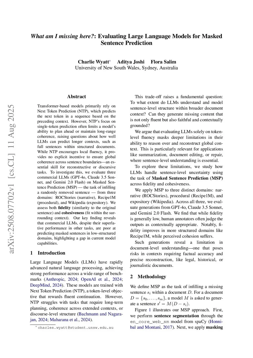 Transformer-based models primarily rely on Next Token Prediction (NTP), which predicts the next token in a sequence based on the preceding context. However, NTP's focus on single-token prediction often limits a model's ability to plan ahead or maintain long-range coherence, raising questions about how well LLMs can predict longer contexts, such as full sentences within structured documents. While NTP encourages local fluency, it provides no explicit incentive to ensure global coherence across sentence boundaries-an essential skill for reconstructive or discursive tasks. To investigate this, we evaluate three commercial LLMs (GPT-4o, Claude 3.5 Sonnet, and Gemini 2.0 Flash) on Masked Sentence Prediction (MSP) - the task of infilling a randomly removed sentence - from three domains: ROCStories (narrative), Recipe1M (procedural), and Wikipedia (expository). We assess both fidelity (similarity to the original sentence) and cohesiveness (fit within the surrounding context). Our key finding reveals that commercial LLMs, despite their superlative performance in other tasks, are poor at predicting masked sentences in low-structured domains, highlighting a gap in current model capabilities.