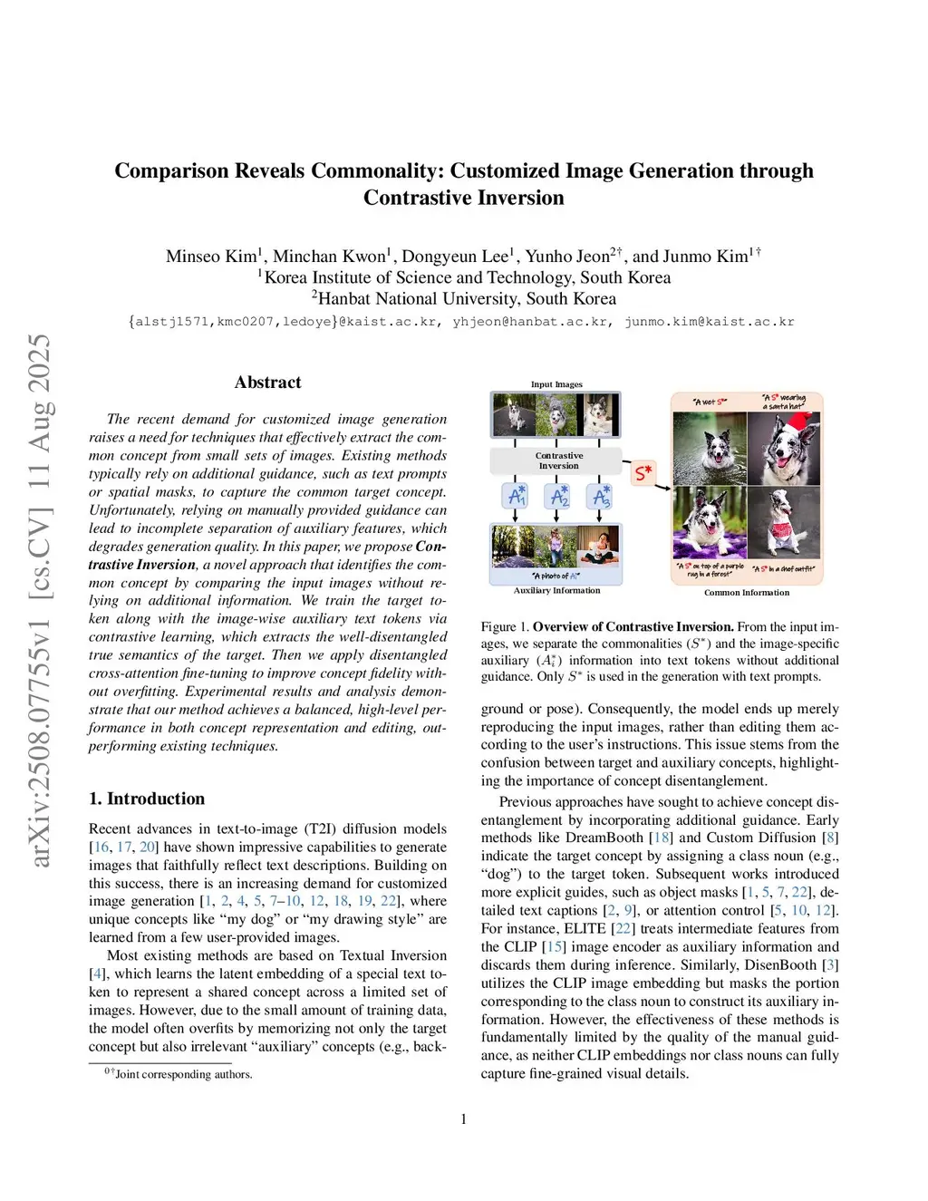 The recent demand for customized image generation raises a need for techniques that effectively extract the common concept from small sets of images. Existing methods typically rely on additional guidance, such as text prompts or spatial masks, to capture the common target concept. Unfortunately, relying on manually provided guidance can lead to incomplete separation of auxiliary features, which degrades generationthis http URLthis paper, we propose Contrastive Inversion, a novel approach that identifies the common concept by comparing the input images without relying on additional information. We train the target token along with the image-wise auxiliary text tokens via contrastive learning, which extracts the well-disentangled true semantics of the target. Then we apply disentangled cross-attention fine-tuning to improve concept fidelity without overfitting. Experimental results and analysis demonstrate that our method achieves a balanced, high-level performance in both concept representation and editing, outperforming existing techniques.