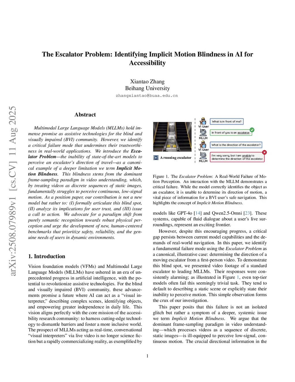 Multimodal Large Language Models (MLLMs) hold immense promise as assistive technologies for the blind and visually impaired (BVI) community. However, we identify a critical failure mode that undermines their trustworthiness in real-world applications. We introduce the Escalator Problem -- the inability of state-of-the-art models to perceive an escalator's direction of travel -- as a canonical example of a deeper limitation we term Implicit Motion Blindness. This blindness stems from the dominant frame-sampling paradigm in video understanding, which, by treating videos as discrete sequences of static images, fundamentally struggles to perceive continuous, low-signal motion. As a position paper, our contribution is not a new model but rather to: (I) formally articulate this blind spot, (II) analyze its implications for user trust, and (III) issue a call to action. We advocate for a paradigm shift from purely semantic recognition towards robust physical perception and urge the development of new, human-centered benchmarks that prioritize safety, reliability, and the genuine needs of users in dynamic environments.