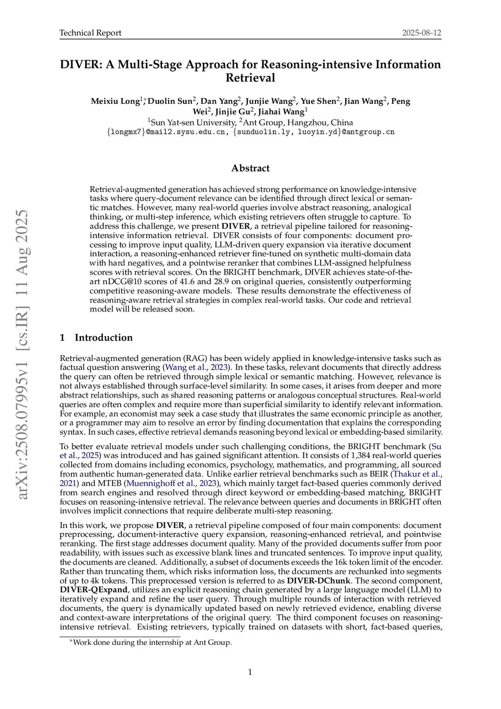 Retrieval-augmented generation has achieved strong performance on knowledge-intensive tasks where query-document relevance can be identified through direct lexical or semantic matches. However, many real-world queries involve abstract reasoning, analogical thinking, or multi-step inference, which existing retrievers often struggle to capture. To address this challenge, we present DIVER, a retrieval pipeline designed for reasoning-intensive information retrieval. It consists of four components. The document preprocessing stage enhances readability and preserves content by cleaning noisy texts and segmenting long documents. The query expansion stage leverages large language models to iteratively refine user queries with explicit reasoning and evidence from retrieved documents. The retrieval stage employs a model fine-tuned on synthetic data spanning medical and mathematical domains, along with hard negatives, enabling effective handling of reasoning-intensive queries. Finally, the reranking stage combines pointwise and listwise strategies to produce both fine-grained and globally consistent rankings. On the BRIGHT benchmark, DIVER achieves state-of-the-art nDCG@10 scores of 46.8 overall and 31.9 on original queries, consistently outperforming competitive reasoning-aware models. These results demonstrate the effectiveness of reasoning-aware retrieval strategies in complex real-world tasks.