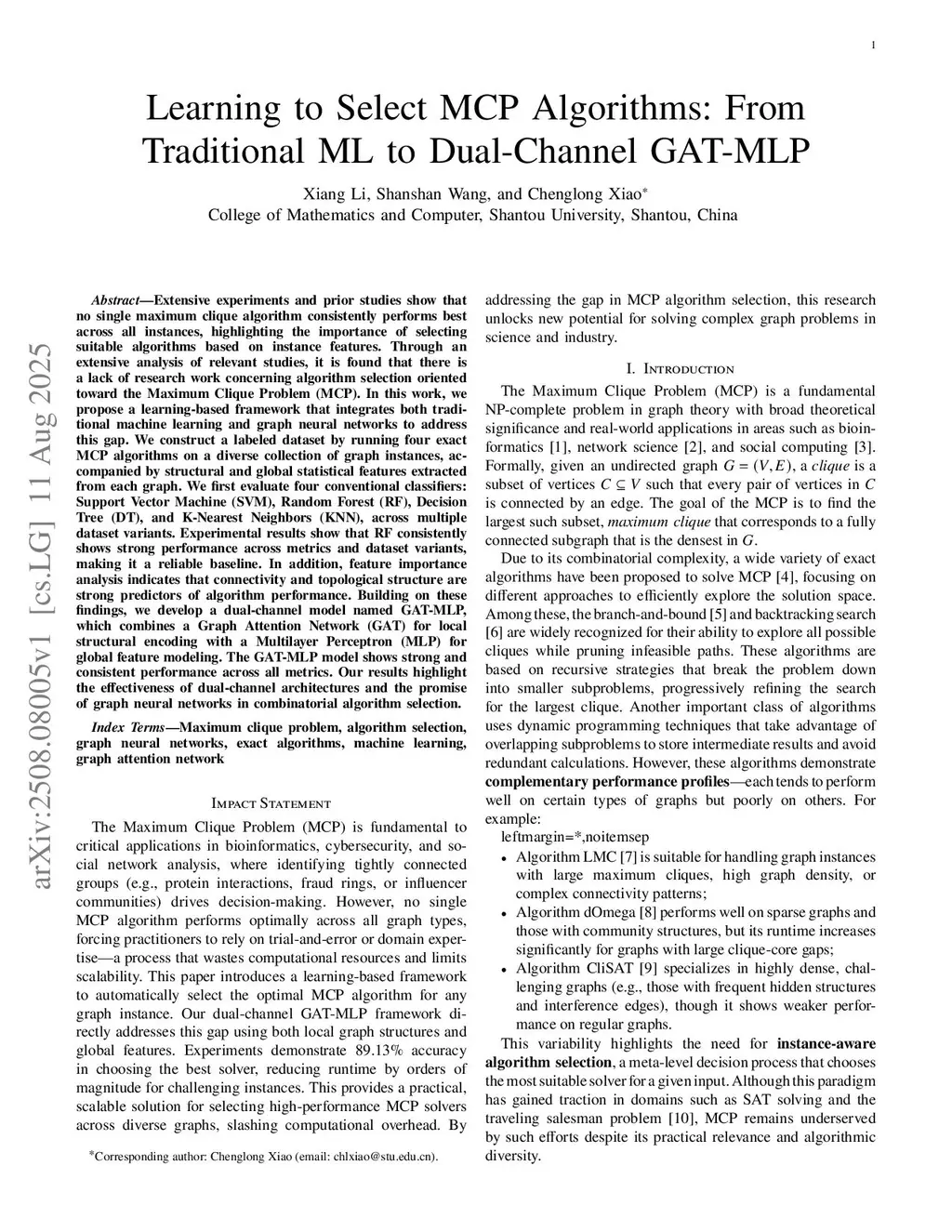 Learning to Select MCP Algorithms: From Traditional ML to Dual-Channel GAT-MLP