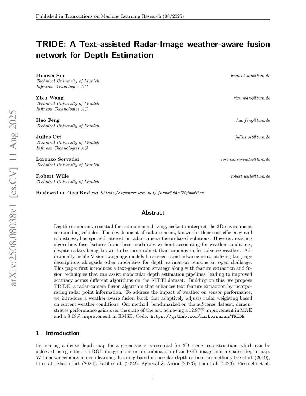 TRIDE: A Text-assisted Radar-Image weather-aware fusion network for Depth Estimation