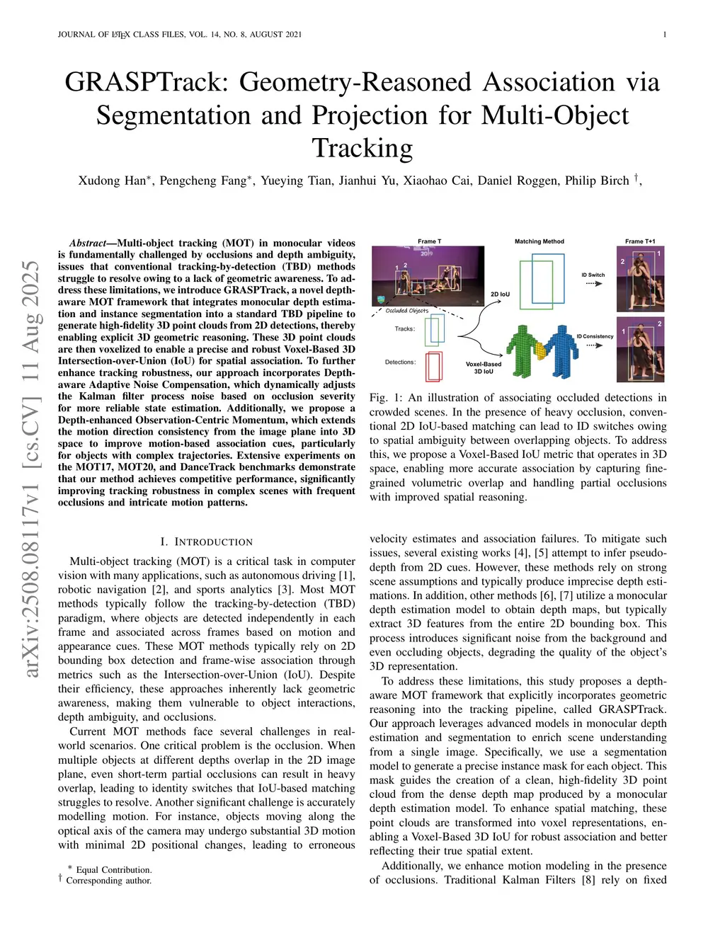 Multi-object tracking (MOT) in monocular videos is fundamentally challenged by occlusions and depth ambiguity, issues that conventional tracking-by-detection (TBD) methods struggle to resolve owing to a lack of geometric awareness. To address these limitations, we introduce GRASPTrack, a novel depth-aware MOT framework that integrates monocular depth estimation and instance segmentation into a standard TBD pipeline to generate high-fidelity 3D point clouds from 2D detections, thereby enabling explicit 3D geometric reasoning. These 3D point clouds are then voxelized to enable a precise and robust Voxel-Based 3D Intersection-over-Union (IoU) for spatial association. To further enhance tracking robustness, our approach incorporates Depth-aware Adaptive Noise Compensation, which dynamically adjusts the Kalman filter process noise based on occlusion severity for more reliable state estimation. Additionally, we propose a Depth-enhanced Observation-Centric Momentum, which extends the motion direction consistency from the image plane into 3D space to improve motion-based association cues, particularly for objects with complex trajectories. Extensive experiments on the MOT17, MOT20, and DanceTrack benchmarks demonstrate that our method achieves competitive performance, significantly improving tracking robustness in complex scenes with frequent occlusions and intricate motion patterns.