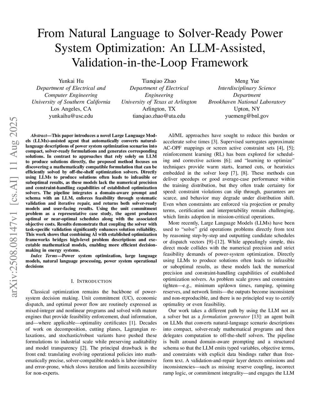 This paper introduces a novel Large Language Models (LLMs)-assisted agent that automatically converts natural-language descriptions of power system optimization scenarios into compact, solver-ready formulations and generates corresponding solutions. In contrast to approaches that rely solely on LLM to produce solutions directly, the proposed method focuses on discovering a mathematically compatible formulation that can be efficiently solved by off-the-shelf optimization solvers. Directly using LLMs to produce solutions often leads to infeasible or suboptimal results, as these models lack the numerical precision and constraint-handling capabilities of established optimization solvers. The pipeline integrates a domain-aware prompt and schema with an LLM, enforces feasibility through systematic validation and iterative repair, and returns both solver-ready models and user-facing results. Using the unit commitment problem as a representative case study, the agent produces optimal or near-optimal schedules along with the associated objective costs. Results demonstrate that coupling the solver with task-specific validation significantly enhances solution reliability. This work shows that combining AI with established optimization frameworks bridges high-level problem descriptions and executable mathematical models, enabling more efficient decision-making in energy systems