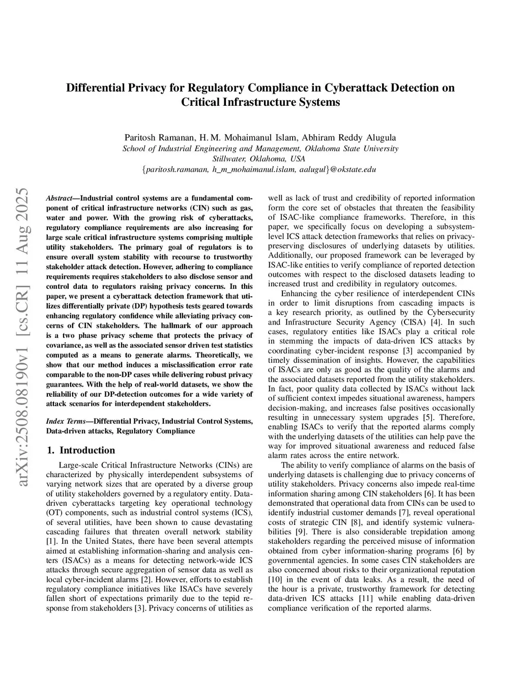 Industrial control systems are a fundamental component of critical infrastructure networks (CIN) such as gas, water and power. With the growing risk of cyberattacks, regulatory compliance requirements are also increasing for large scale critical infrastructure systems comprising multiple utility stakeholders. The primary goal of regulators is to ensure overall system stability with recourse to trustworthy stakeholder attack detection. However, adhering to compliance requirements requires stakeholders to also disclose sensor and control data to regulators raising privacy concerns. In this paper, we present a cyberattack detection framework that utilizes differentially private (DP) hypothesis tests geared towards enhancing regulatory confidence while alleviating privacy concerns of CIN stakeholders. The hallmark of our approach is a two phase privacy scheme that protects the privacy of covariance, as well as the associated sensor driven test statistics computed as a means to generate alarms. Theoretically, we show that our method induces a misclassification error rate comparable to the non-DP cases while delivering robust privacy guarantees. With the help of real-world datasets, we show the reliability of our DP-detection outcomes for a wide variety of attack scenarios for interdependent stakeholders.