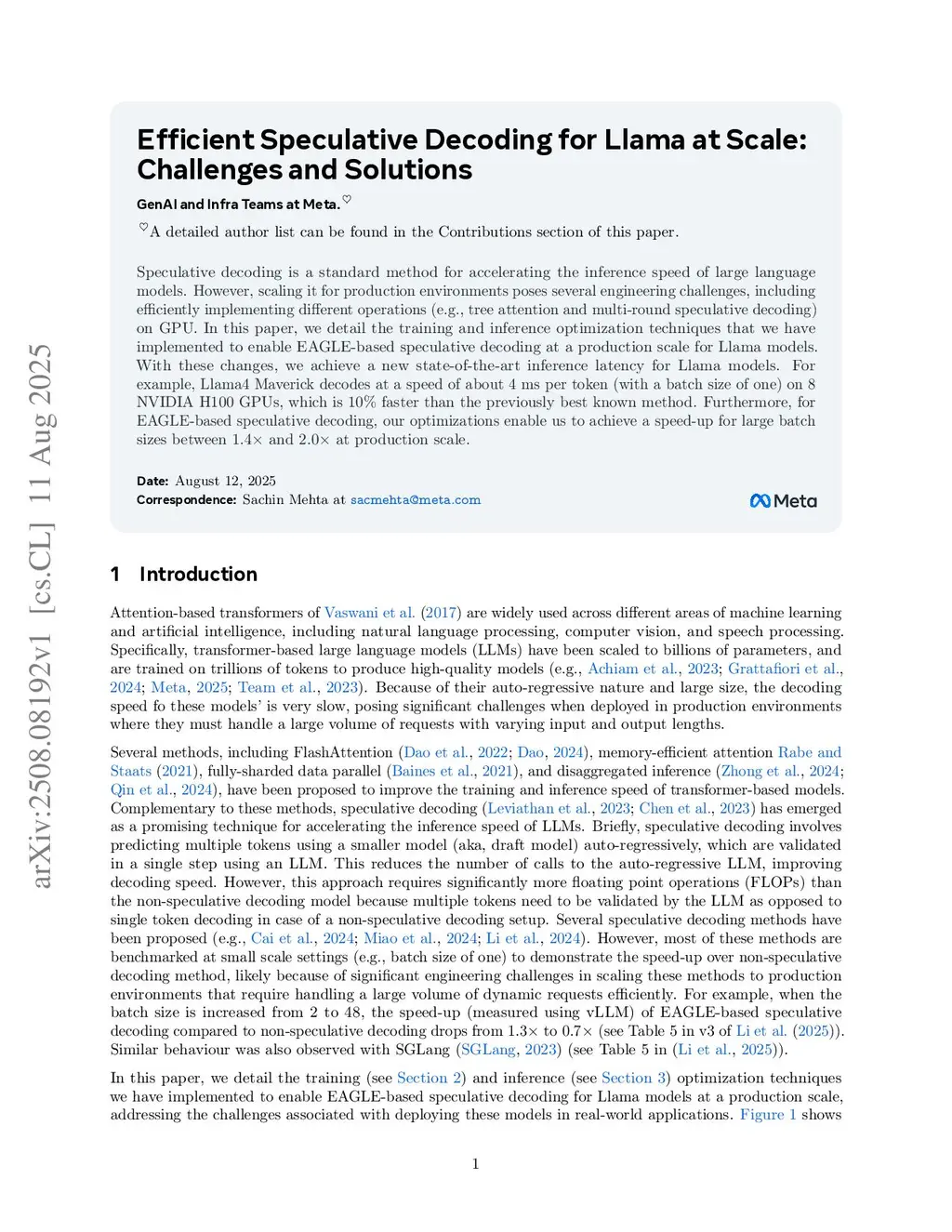 Speculative decoding is a standard method for accelerating the inference speed of large language models. However, scaling it for production environments poses several engineering challenges, including efficiently implementing different operations (e.g., tree attention and multi-round speculative decoding) on GPU. In this paper, we detail the training and inference optimization techniques that we have implemented to enable EAGLE-based speculative decoding at a production scale for Llama models. With these changes, we achieve a new state-of-the-art inference latency for Llama models. For example, Llama4 Maverick decodes at a speed of about 4 ms per token (with a batch size of one) on 8 NVIDIA H100 GPUs, which is 10% faster than the previously best known method. Furthermore, for EAGLE-based speculative decoding, our optimizations enable us to achieve a speed-up for large batch sizes between 1.4x and 2.0x at production scale.