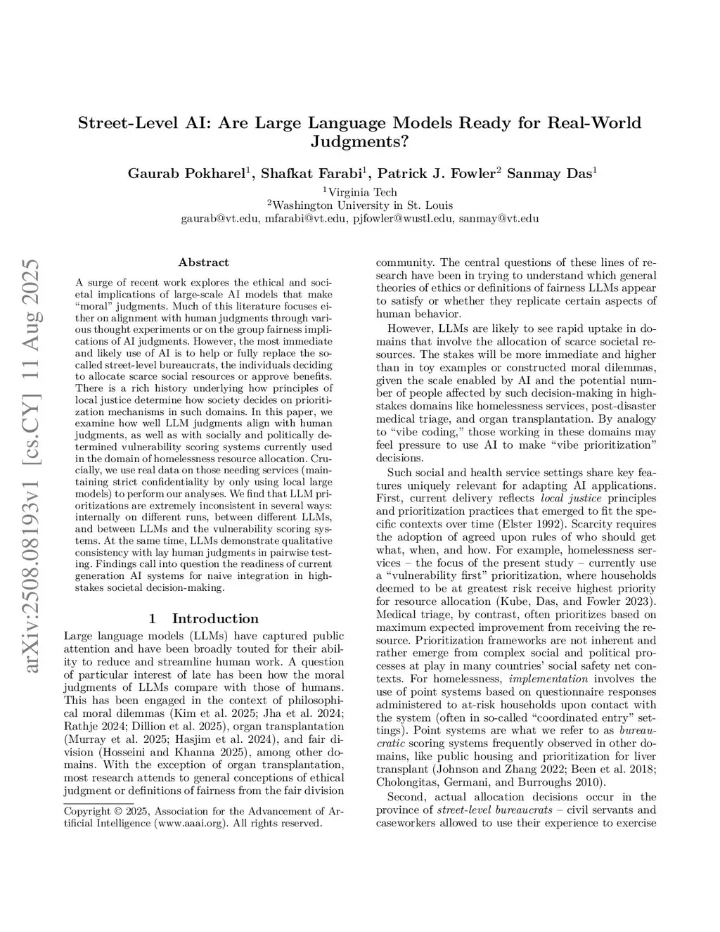 A surge of recent work explores the ethical and societal implications of large-scale AI models that make "moral" judgments. Much of this literature focuses either on alignment with human judgments through various thought experiments or on the group fairness implications of AI judgments. However, the most immediate and likely use of AI is to help or fully replace the so-called street-level bureaucrats, the individuals deciding to allocate scarce social resources or approve benefits. There is a rich history underlying how principles of local justice determine how society decides on prioritization mechanisms in such domains. In this paper, we examine how well LLM judgments align with human judgments, as well as with socially and politically determined vulnerability scoring systems currently used in the domain of homelessness resource allocation. Crucially, we use real data on those needing services (maintaining strict confidentiality by only using local large models) to perform our analyses. We find that LLM prioritizations are extremely inconsistent in several ways: internally on different runs, between different LLMs, and between LLMs and the vulnerability scoring systems. At the same time, LLMs demonstrate qualitative consistency with lay human judgments in pairwise testing. Findings call into question the readiness of current generation AI systems for naive integration in high-stakes societal decision-making.