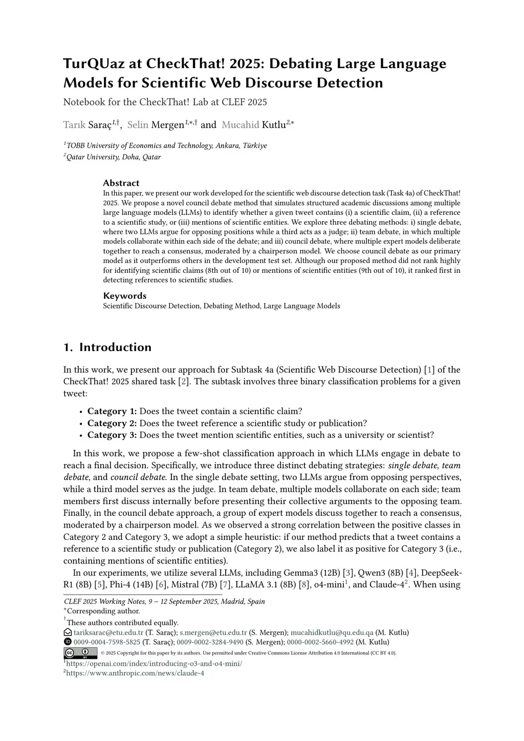 In this paper, we present our work developed for the scientific web discourse detection task (Task 4a) of CheckThat! 2025. We propose a novel council debate method that simulates structured academic discussions among multiple large language models (LLMs) to identify whether a given tweet contains (i) a scientific claim, (ii) a reference to a scientific study, or (iii) mentions of scientific entities. We explore three debating methods: i) single debate, where two LLMs argue for opposing positions while a third acts as a judge; ii) team debate, in which multiple models collaborate within each side of the debate; and iii) council debate, where multiple expert models deliberate together to reach a consensus, moderated by a chairperson model. We choose council debate as our primary model as it outperforms others in the development test set. Although our proposed method did not rank highly for identifying scientific claims (8th out of 10) or mentions of scientific entities (9th out of 10), it ranked first in detecting references to scientific studies.