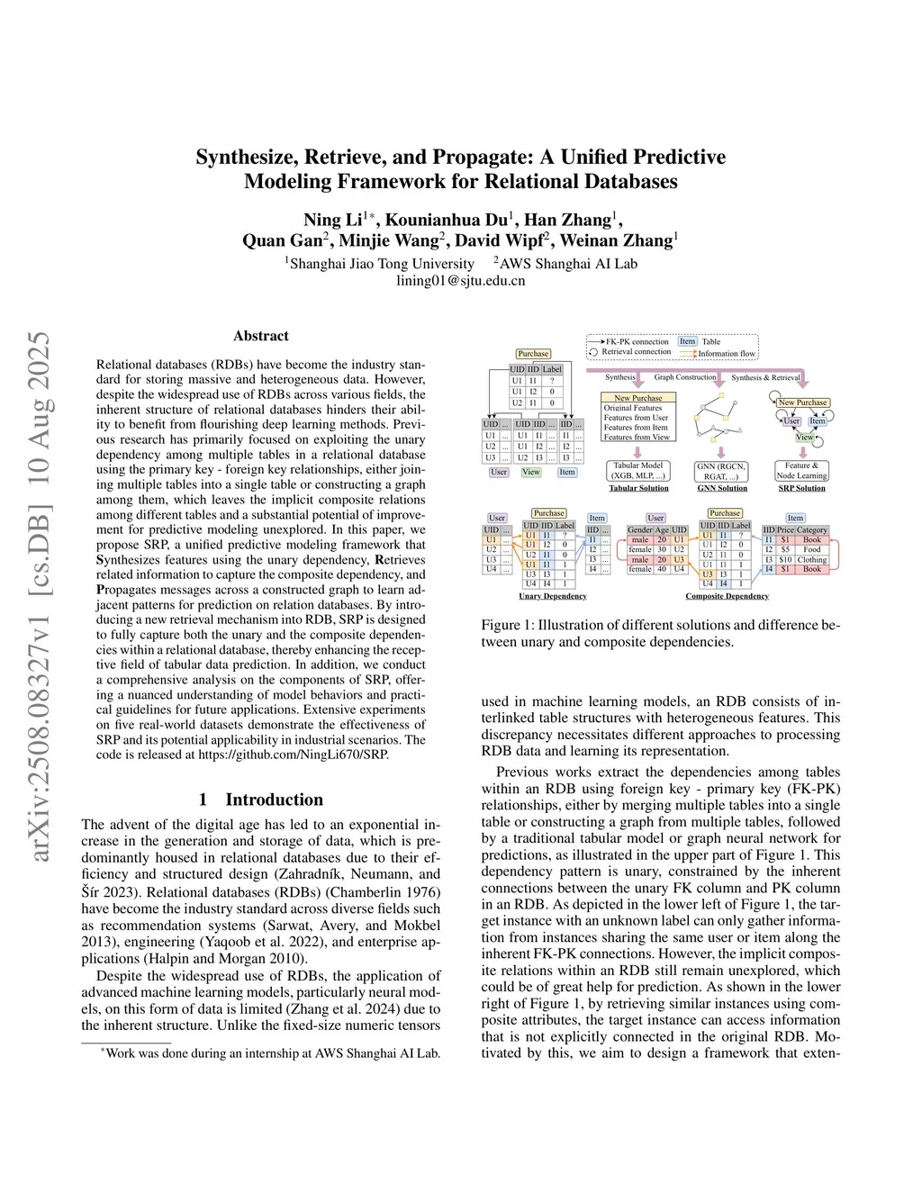 Relational databases (RDBs) have become the industry standard for storing massive and heterogeneous data. However, despite the widespread use of RDBs across various fields, the inherent structure of relational databases hinders their ability to benefit from flourishing deep learning methods. Previous research has primarily focused on exploiting the unary dependency among multiple tables in a relational database using the primary key - foreign key relationships, either joining multiple tables into a single table or constructing a graph among them, which leaves the implicit composite relations among different tables and a substantial potential of improvement for predictive modeling unexplored. In this paper, we propose SRP, a unified predictive modeling framework that synthesizes features using the unary dependency, retrieves related information to capture the composite dependency, and propagates messages across a constructed graph to learn adjacent patterns for prediction on relation databases. By introducing a new retrieval mechanism into RDB, SRP is designed to fully capture both the unary and the composite dependencies within a relational database, thereby enhancing the receptive field of tabular data prediction. In addition, we conduct a comprehensive analysis on the components of SRP, offering a nuanced understanding of model behaviors and practical guidelines for future applications. Extensive experiments on five real-world datasets demonstrate the effectiveness of SRP and its potential applicability in industrial scenarios. The code is released atthis https URL.