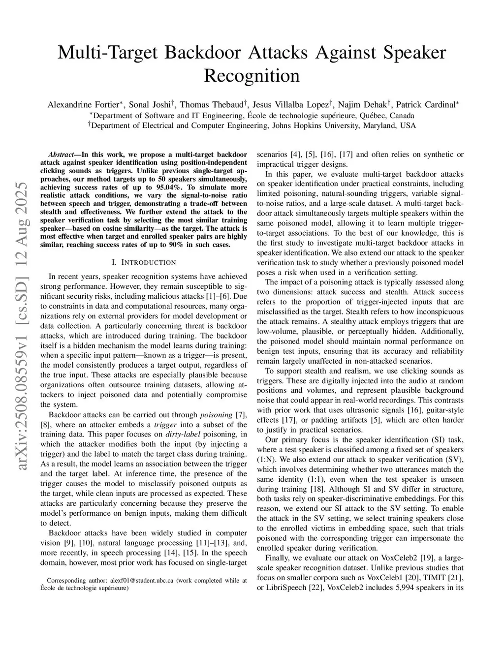 In this work, we propose a multi-target backdoor attack against speaker identification using position-independent clicking sounds as triggers. Unlike previous single-target approaches, our method targets up to 50 speakers simultaneously, achieving success rates of up to 95.04%. To simulate more realistic attack conditions, we vary the signal-to-noise ratio between speech and trigger, demonstrating a trade-off between stealth and effectiveness. We further extend the attack to the speaker verification task by selecting the most similar training speaker - based on cosine similarity - as a proxy target. The attack is most effective when target and enrolled speaker pairs are highly similar, reaching success rates of up to 90% in such cases.
