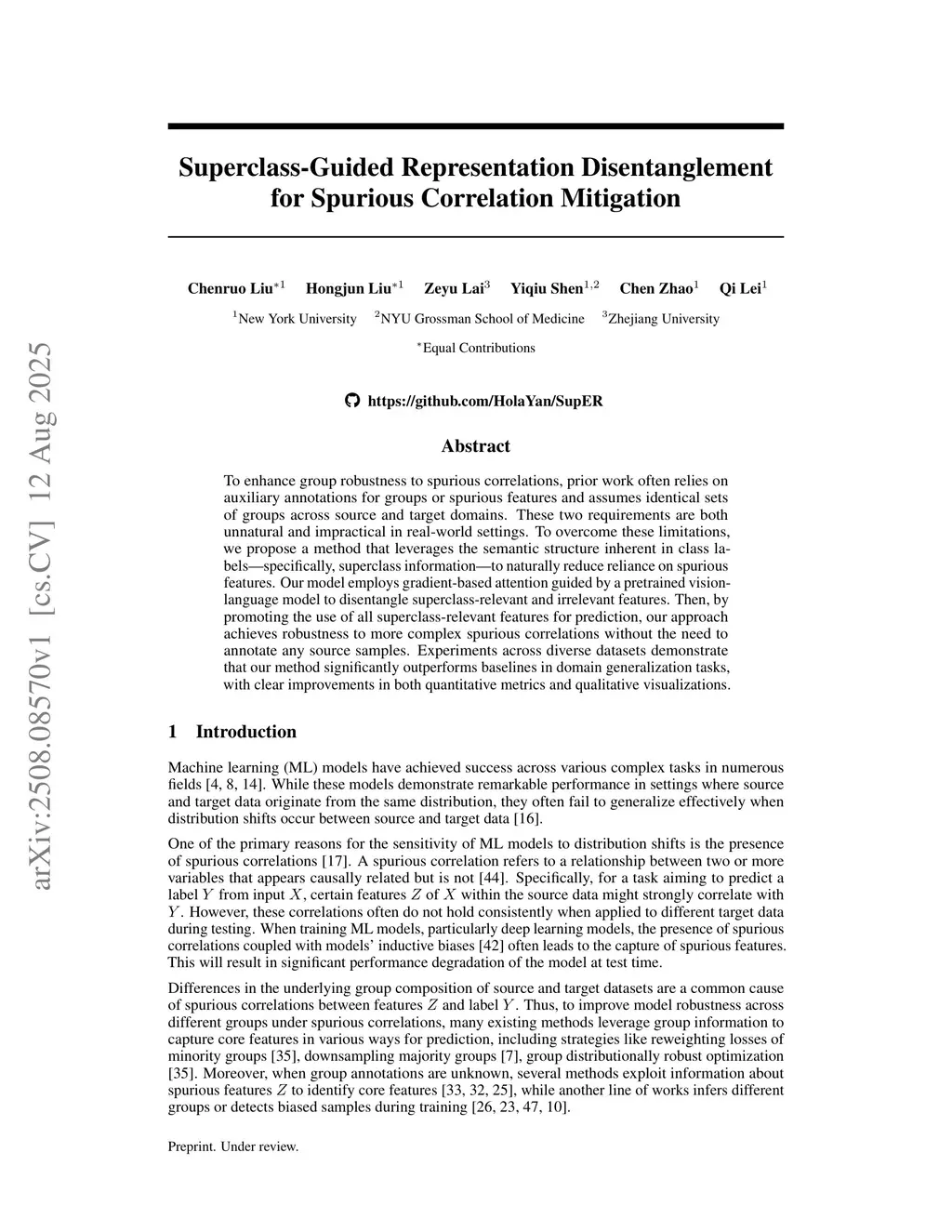 To enhance group robustness to spurious correlations, prior work often relies on auxiliary group annotations and assumes identical sets of groups across training and test domains. To overcome these limitations, we propose to leverage superclasses -- categories that lie higher in the semantic hierarchy than the task's actual labels -- as a more intrinsic signal than group labels for discerning spurious correlations. Our model incorporates superclass guidance from a pretrained vision-language model via gradient-based attention alignment, and then integrates feature disentanglement with a theoretically supported minimax-optimal feature-usage strategy. As a result, our approach attains robustness to more complex group structures and spurious correlations, without the need to annotate any training samples. Experiments across diverse domain generalization tasks show that our method significantly outperforms strong baselines and goes well beyond the vision-language model's guidance, with clear improvements in both quantitative metrics and qualitative visualizations.