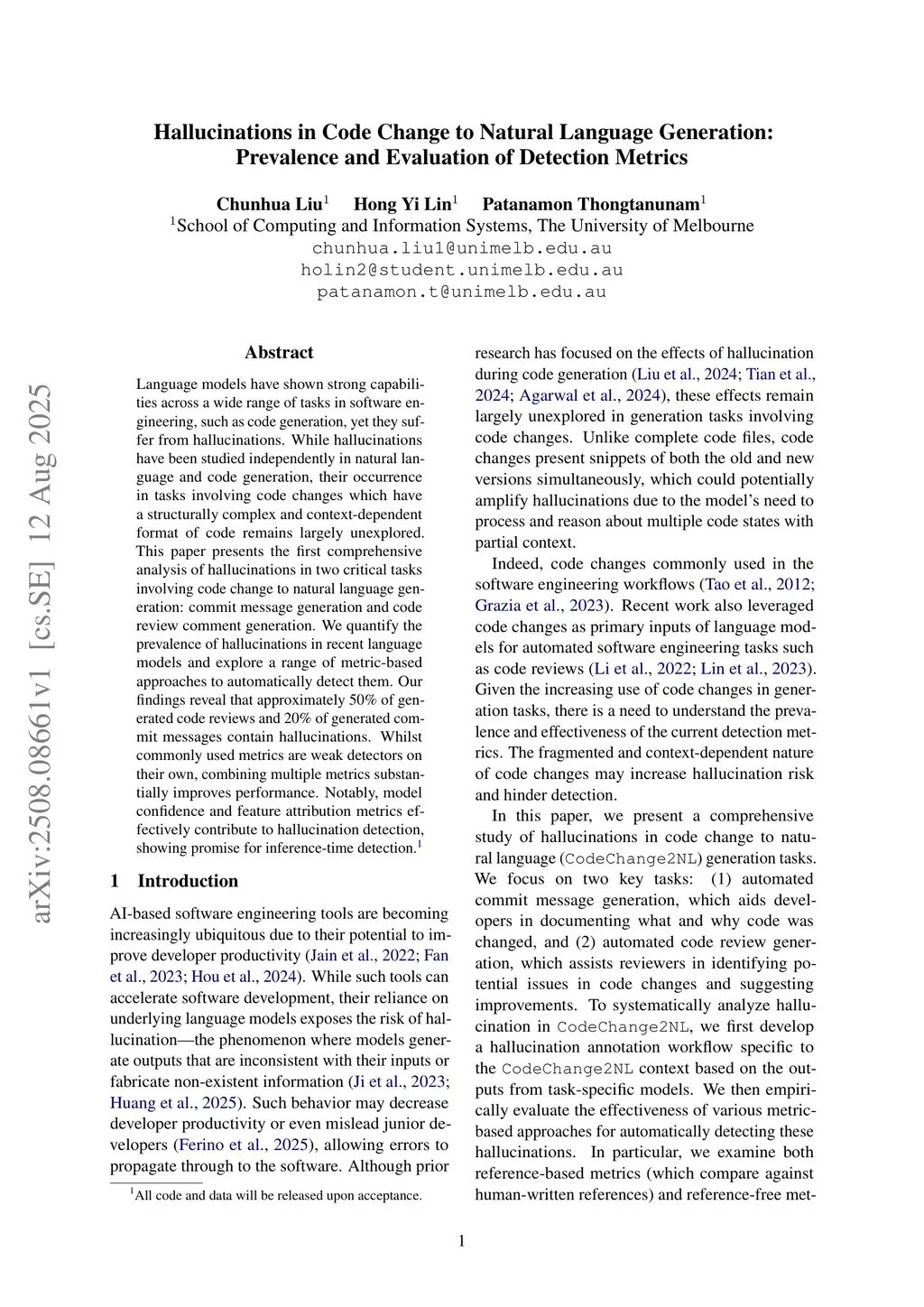 Language models have shown strong capabilities across a wide range of tasks in software engineering, such as code generation, yet they suffer from hallucinations. While hallucinations have been studied independently in natural language and code generation, their occurrence in tasks involving code changes which have a structurally complex and context-dependent format of code remains largely unexplored. This paper presents the first comprehensive analysis of hallucinations in two critical tasks involving code change to natural language generation: commit message generation and code review comment generation. We quantify the prevalence of hallucinations in recent language models and explore a range of metric-based approaches to automatically detect them. Our findings reveal that approximately 50\% of generated code reviews and 20\% of generated commit messages contain hallucinations. Whilst commonly used metrics are weak detectors on their own, combining multiple metrics substantially improves performance. Notably, model confidence and feature attribution metrics effectively contribute to hallucination detection, showing promise for inference-time detection.\footnote{All code and data will be released upon acceptance.