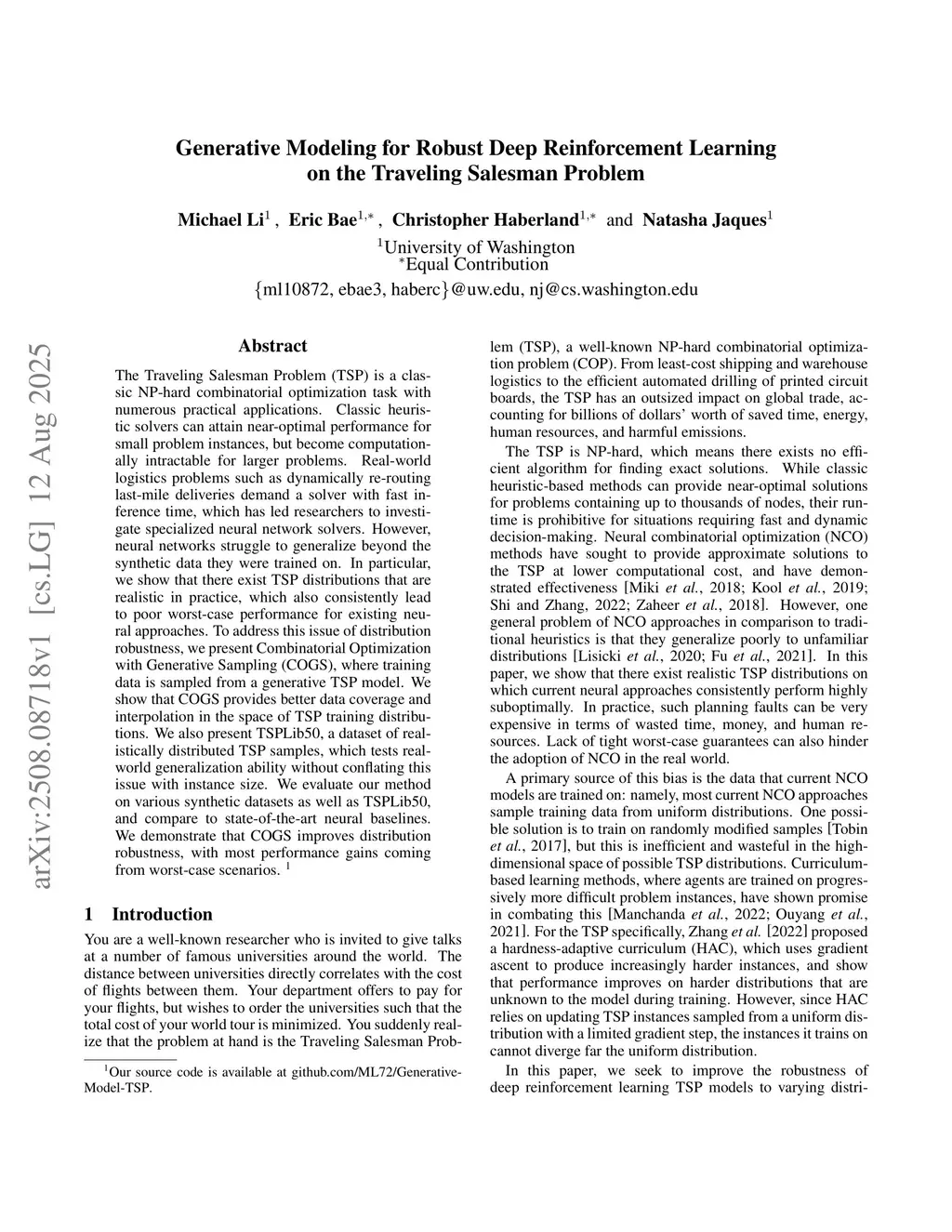 The Traveling Salesman Problem (TSP) is a classic NP-hard combinatorial optimization task with numerous practical applications. Classic heuristic solvers can attain near-optimal performance for small problem instances, but become computationally intractable for larger problems. Real-world logistics problems such as dynamically re-routing last-mile deliveries demand a solver with fast inference time, which has led researchers to investigate specialized neural network solvers. However, neural networks struggle to generalize beyond the synthetic data they were trained on. In particular, we show that there exist TSP distributions that are realistic in practice, which also consistently lead to poor worst-case performance for existing neural approaches. To address this issue of distribution robustness, we present Combinatorial Optimization with Generative Sampling (COGS), where training data is sampled from a generative TSP model. We show that COGS provides better data coverage and interpolation in the space of TSP training distributions. We also present TSPLib50, a dataset of realistically distributed TSP samples, which tests real-world generalization ability without conflating this issue with instance size. We evaluate our method on various synthetic datasets as well as TSPLib50, and compare to state-of-the-art neural baselines. We demonstrate that COGS improves distribution robustness, with most performance gains coming from worst-case scenarios.