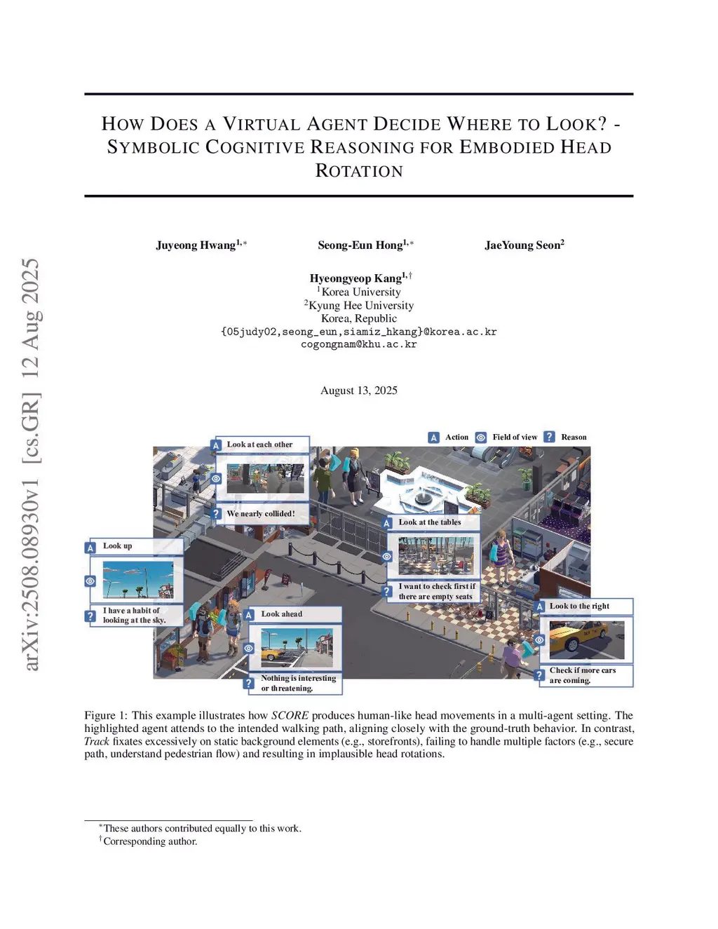 Natural head rotation is critical for believable embodied virtual agents, yet this micro-level behavior remains largely underexplored. While head-rotation prediction algorithms could, in principle, reproduce this behavior, they typically focus on visually salient stimuli and overlook the cognitive motives that guide head rotation. This yields agents that look at conspicuous objects while overlooking obstacles or task-relevant cues, diminishing realism in a virtual environment. We introduce SCORE, a Symbolic Cognitive Reasoning framework for Embodied Head Rotation, a data-agnostic framework that produces context-aware head movements without task-specific training or hand-tuned heuristics. A controlled VR study (N=20) identifies five motivational drivers of human head movements: Interest, Information Seeking, Safety, Social Schema, and Habit. SCORE encodes these drivers as symbolic predicates, perceives the scene with a Vision-Language Model (VLM), and plans head poses with a Large Language Model (LLM). The framework employs a hybrid workflow: the VLM-LLM reasoning is executed offline, after which a lightweight FastVLM performs online validation to suppress hallucinations while maintaining responsiveness to scene dynamics. The result is an agent that predicts not only where to look but also why, generalizing to unseen scenes and multi-agent crowds while retaining behavioral plausibility.