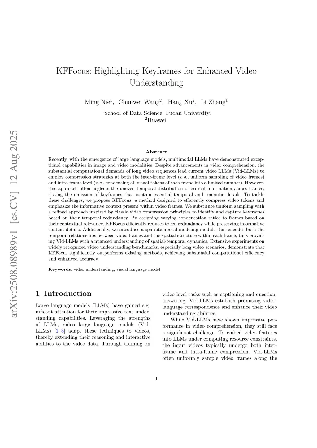 Recently, with the emergence of large language models, multimodal LLMs have demonstrated exceptional capabilities in image and video modalities. Despite advancements in video comprehension, the substantial computational demands of long video sequences lead current video LLMs (Vid-LLMs) to employ compression strategies at both the inter-frame level (e.g., uniform sampling of video frames) and intra-frame level (e.g., condensing all visual tokens of each frame into a limited number). However, this approach often neglects the uneven temporal distribution of critical information across frames, risking the omission of keyframes that contain essential temporal and semantic details. To tackle these challenges, we propose KFFocus, a method designed to efficiently compress video tokens and emphasize the informative context present within video frames. We substitute uniform sampling with a refined approach inspired by classic video compression principles to identify and capture keyframes based on their temporal redundancy. By assigning varying condensation ratios to frames based on their contextual relevance, KFFocus efficiently reduces token redundancy while preserving informative content details. Additionally, we introduce a spatiotemporal modeling module that encodes both the temporal relationships between video frames and the spatial structure within each frame, thus providing Vid-LLMs with a nuanced understanding of spatial-temporal dynamics. Extensive experiments on widely recognized video understanding benchmarks, especially long video scenarios, demonstrate that KFFocus significantly outperforms existing methods, achieving substantial computational efficiency and enhanced accuracy.