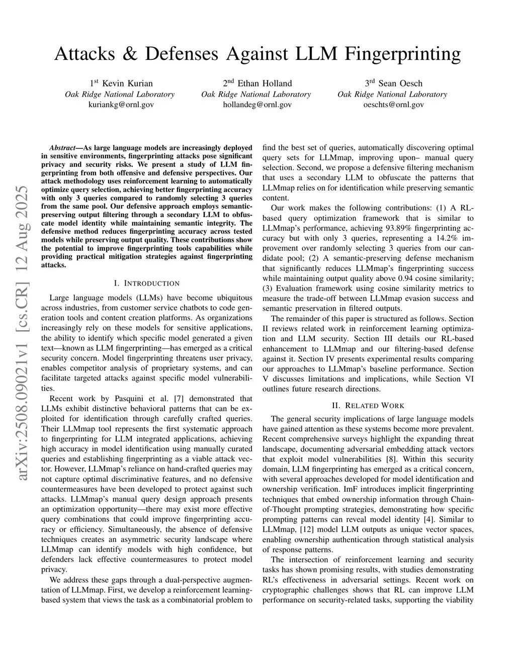 As large language models are increasingly deployed in sensitive environments, fingerprinting attacks pose significant privacy and security risks. We present a study of LLM fingerprinting from both offensive and defensive perspectives. Our attack methodology uses reinforcement learning to automatically optimize query selection, achieving better fingerprinting accuracy with only 3 queries compared to randomly selecting 3 queries from the same pool. Our defensive approach employs semantic-preserving output filtering through a secondary LLM to obfuscate model identity while maintaining semantic integrity. The defensive method reduces fingerprinting accuracy across tested models while preserving output quality. These contributions show the potential to improve fingerprinting tools capabilities while providing practical mitigation strategies against fingerprinting attacks.