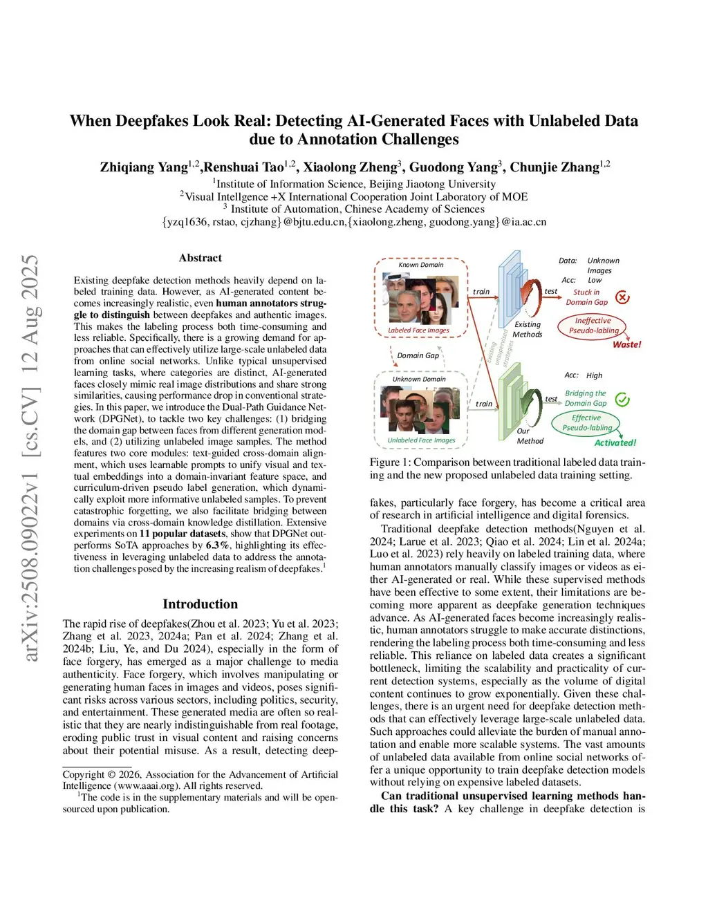Existing deepfake detection methods heavily depend on labeled training data. However, as AI-generated content becomes increasingly realistic, even \textbf{human annotators struggle to distinguish} between deepfakes and authentic images. This makes the labeling process both time-consuming and less reliable. Specifically, there is a growing demand for approaches that can effectively utilize large-scale unlabeled data from online social networks. Unlike typical unsupervised learning tasks, where categories are distinct, AI-generated faces closely mimic real image distributions and share strong similarities, causing performance drop in conventional strategies. In this paper, we introduce the Dual-Path Guidance Network (DPGNet), to tackle two key challenges: (1) bridging the domain gap between faces from different generation models, and (2) utilizing unlabeled image samples. The method features two core modules: text-guided cross-domain alignment, which uses learnable prompts to unify visual and textual embeddings into a domain-invariant feature space, and curriculum-driven pseudo label generation, which dynamically exploit more informative unlabeled samples. To prevent catastrophic forgetting, we also facilitate bridging between domains via cross-domain knowledge distillation. Extensive experiments on \textbf{11 popular datasets}, show that DPGNet outperforms SoTA approaches by \textbf{6.3\%}, highlighting its effectiveness in leveraging unlabeled data to address the annotation challenges posed by the increasing realism of deepfakes.