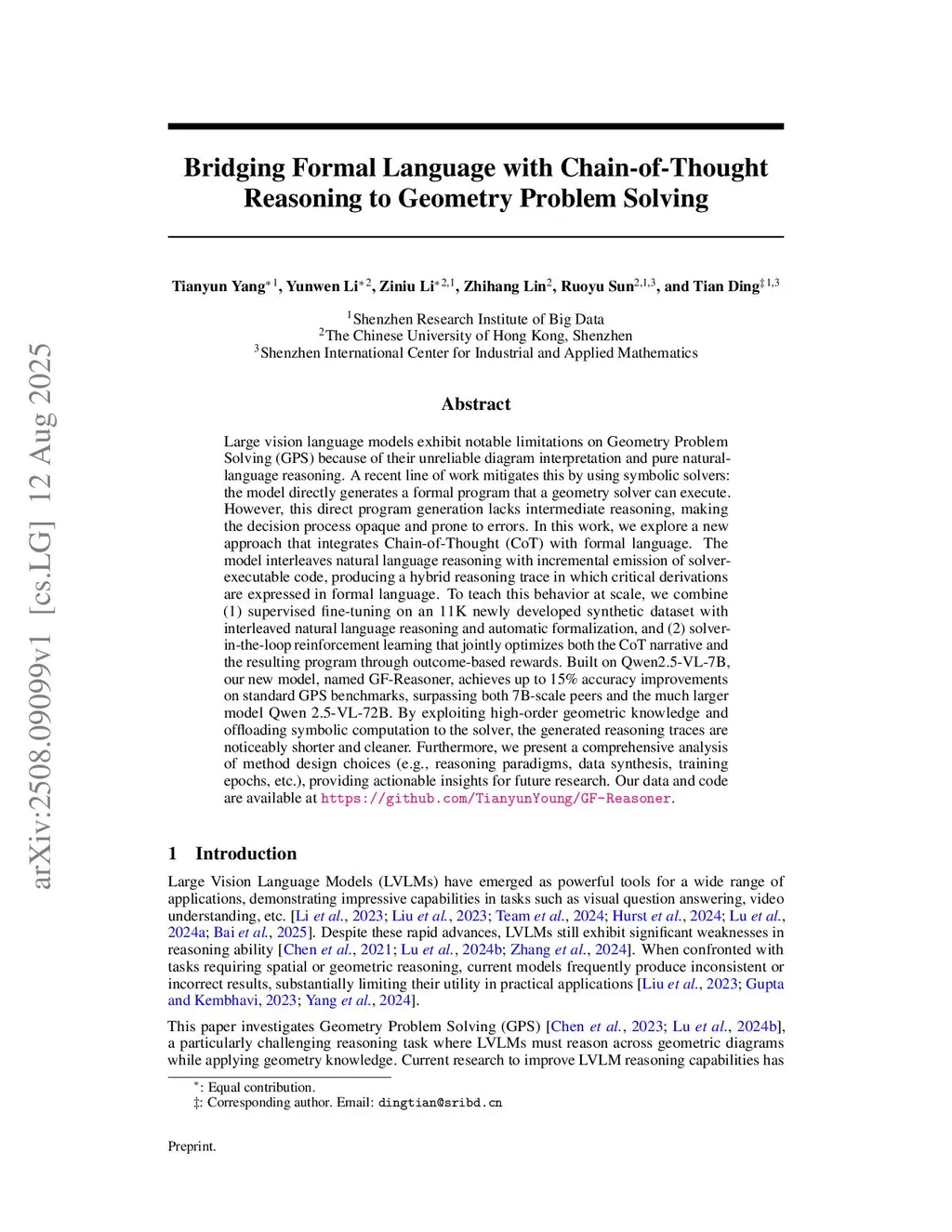 Large vision language models exhibit notable limitations on Geometry Problem Solving (GPS) because of their unreliable diagram interpretation and pure natural-language reasoning. A recent line of work mitigates this by using symbolic solvers: the model directly generates a formal program that a geometry solver can execute. However, this direct program generation lacks intermediate reasoning, making the decision process opaque and prone to errors. In this work, we explore a new approach that integrates Chain-of-Thought (CoT) with formal language. The model interleaves natural language reasoning with incremental emission of solver-executable code, producing a hybrid reasoning trace in which critical derivations are expressed in formal language. To teach this behavior at scale, we combine (1) supervised fine-tuning on an 11K newly developed synthetic dataset with interleaved natural language reasoning and automatic formalization, and (2) solver-in-the-loop reinforcement learning that jointly optimizes both the CoT narrative and the resulting program through outcome-based rewards. Built on Qwen2.5-VL-7B, our new model, named GF-Reasoner, achieves up to 15% accuracy improvements on standard GPS benchmarks, surpassing both 7B-scale peers and the much larger model Qwen2.5-VL-72B. By exploiting high-order geometric knowledge and offloading symbolic computation to the solver, the generated reasoning traces are noticeably shorter and cleaner. Furthermore, we present a comprehensive analysis of method design choices (e.g., reasoning paradigms, data synthesis, training epochs, etc.), providing actionable insights for future research.